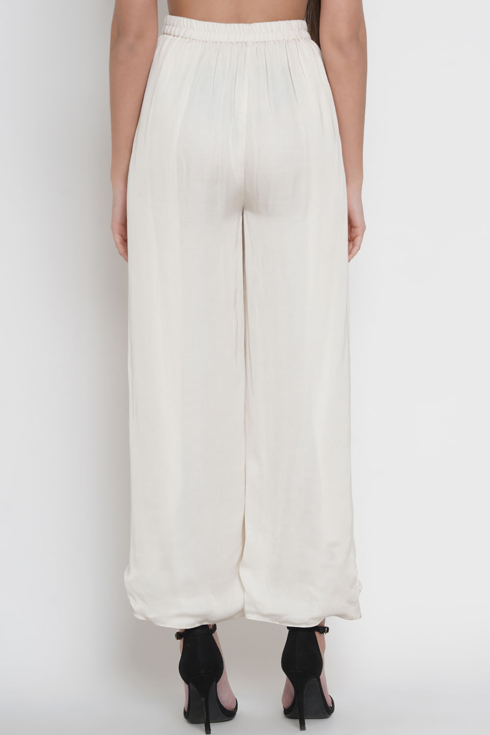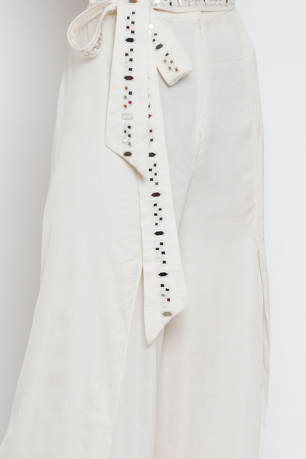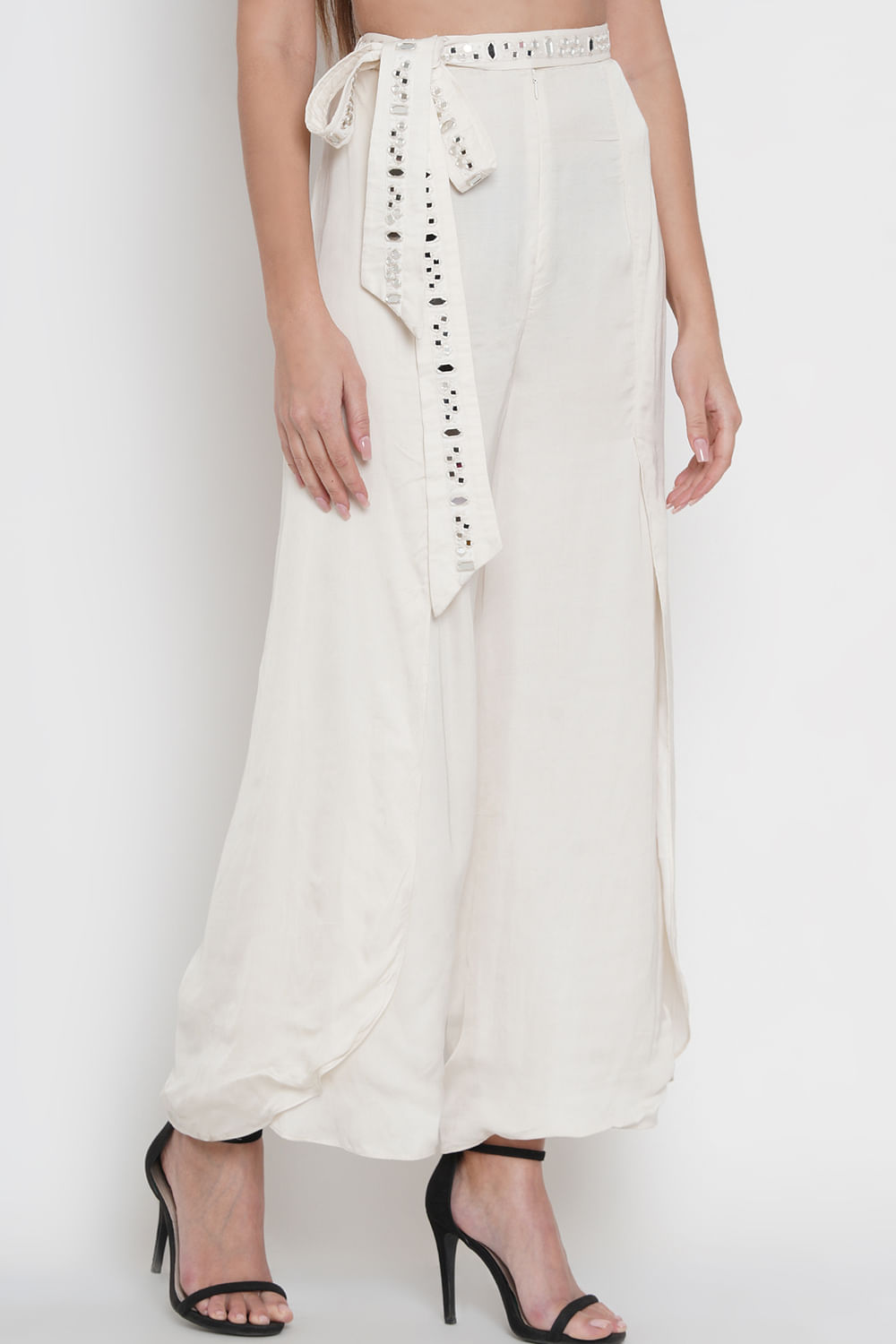 Twenty Nine designs a versatile tunic in crushed bandhani patterned silk with long side slits, paired with wide-legged pants. Style the look with a bohemian handbag.