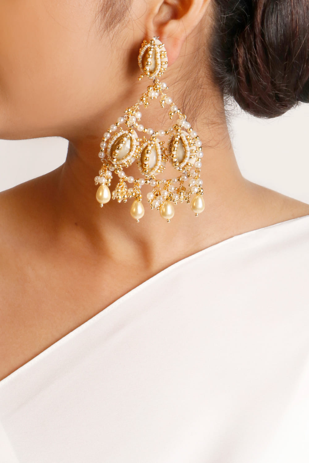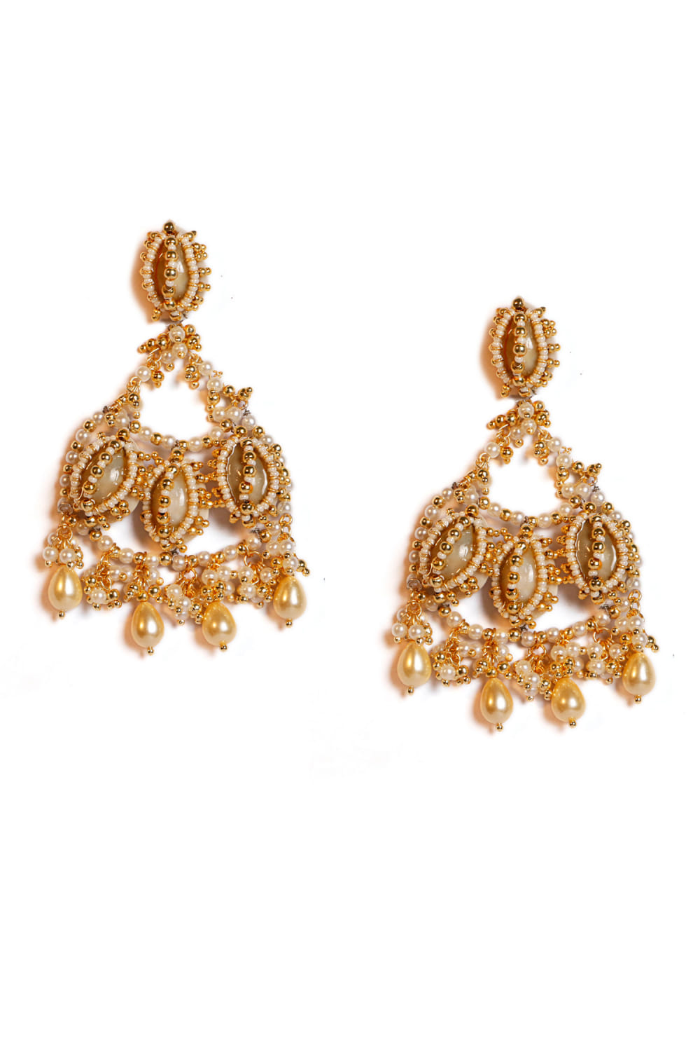 Vaidaan designs this mesmerising pair of dangler earrings with intricate pearl and shell embellishments, crafted in 22kt gold finish. Style them with a traditional saree.