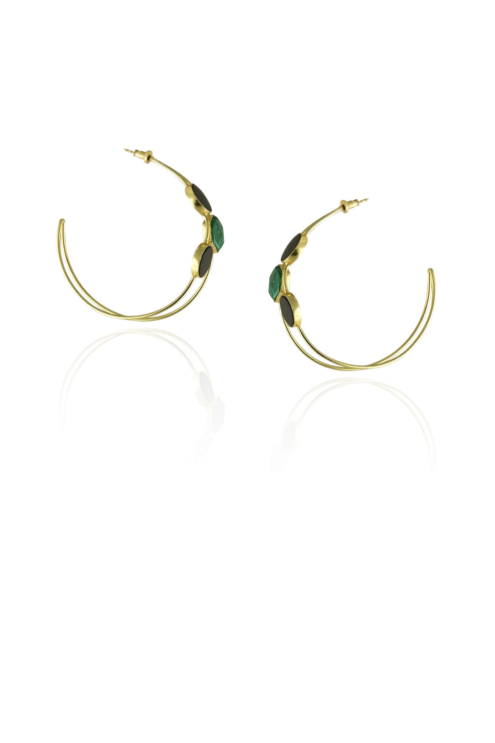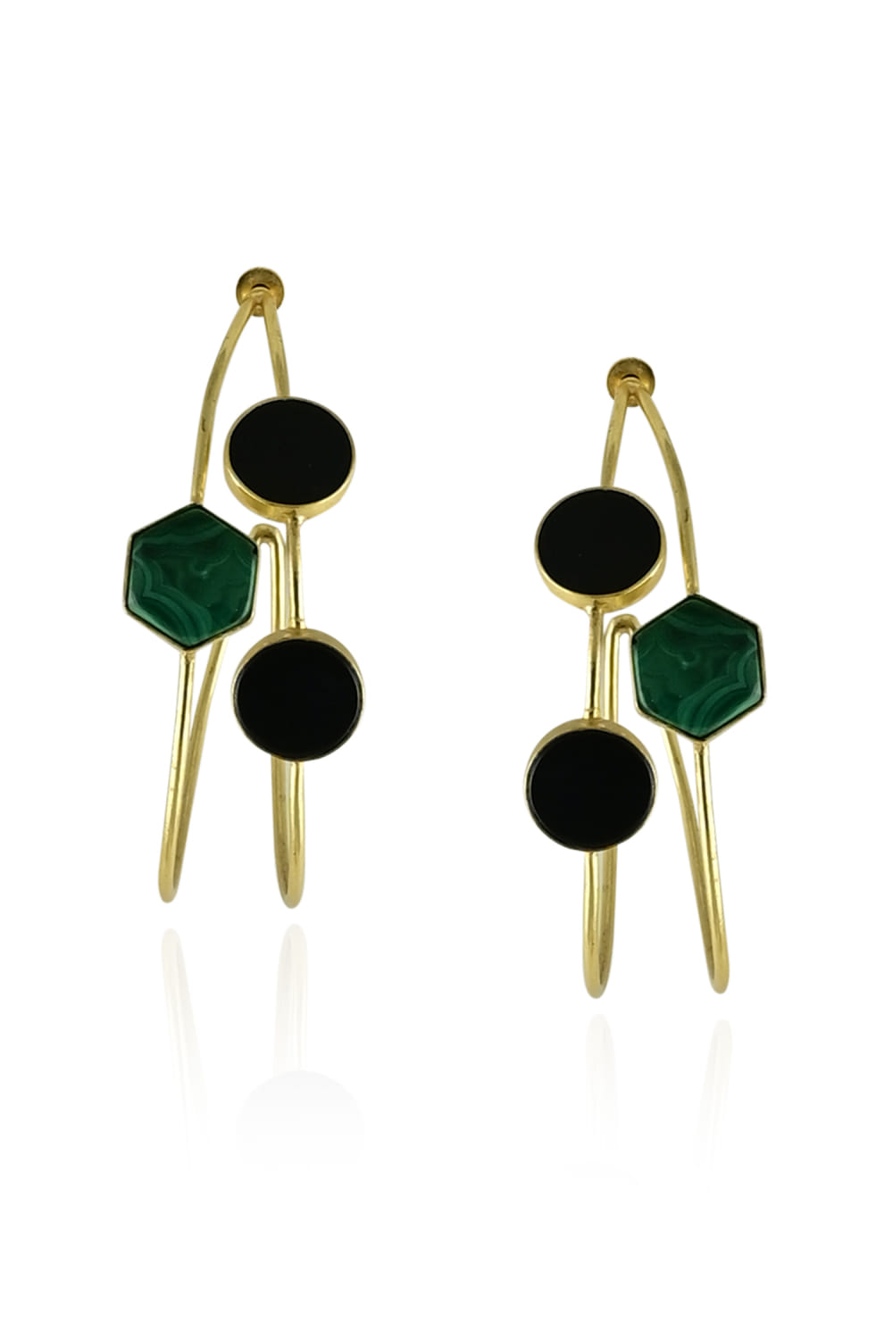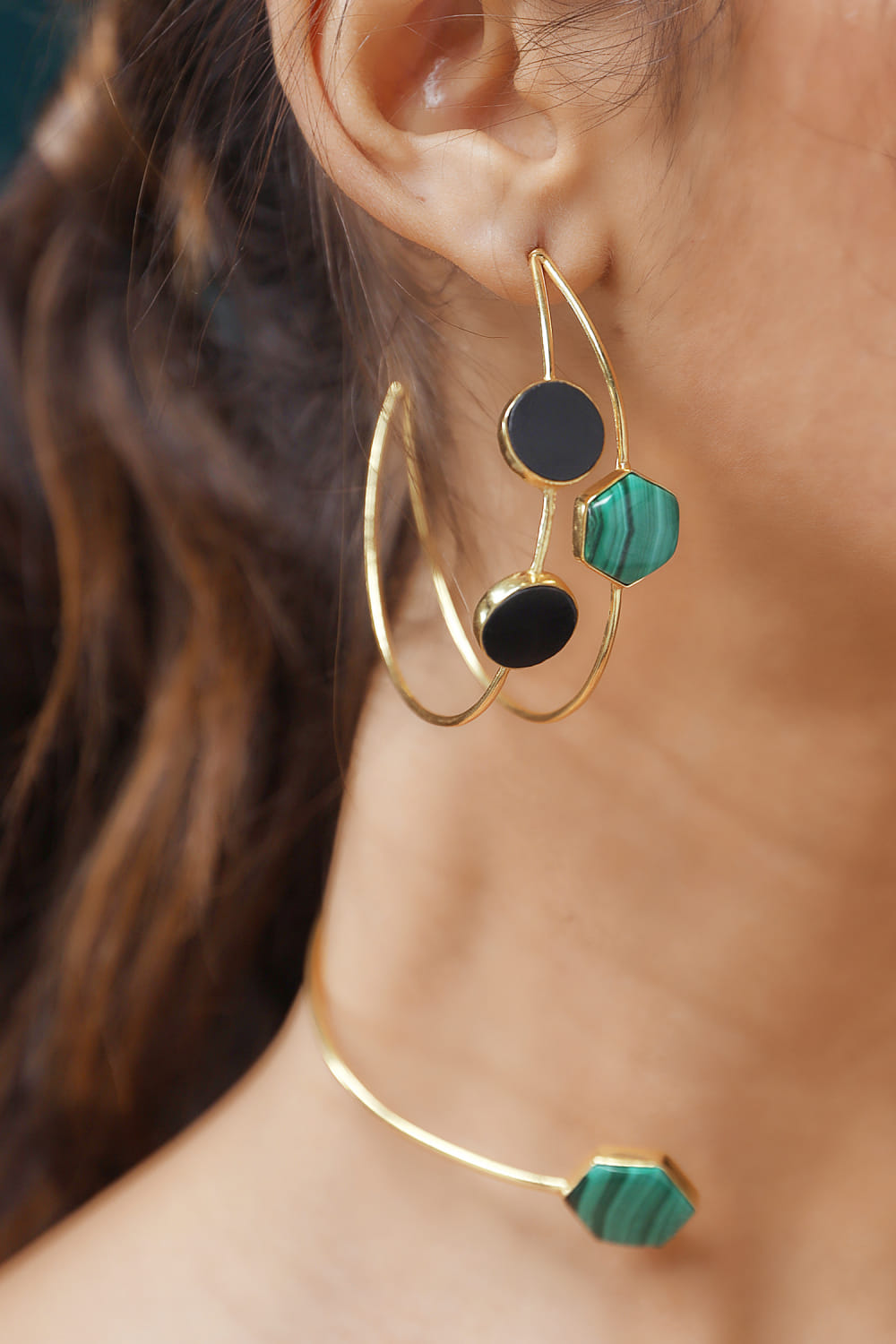 Varnika Arora designs this classy pair of hoops in a 22kt gold finish crafted with malachite and black onyx in geometric shapes. Accessorise them with a jogger set for a stylish day-out look.