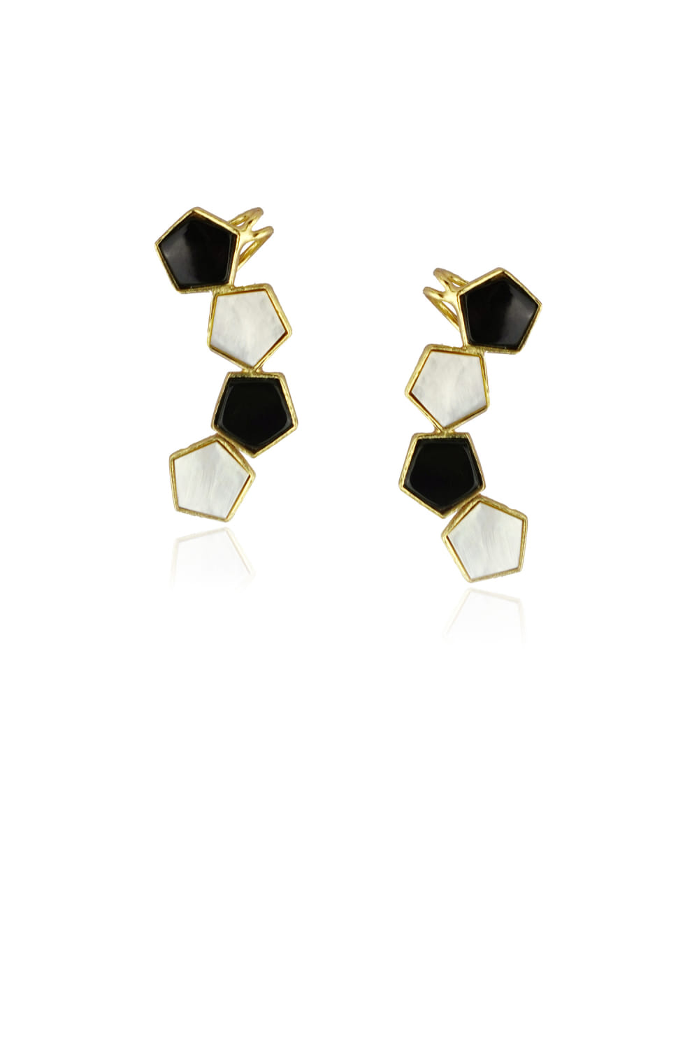 Varnika Arora designs this admirable pair of cuff earrings embellished with enamel and mother-of-pearl detailing in a geometric pattern crafted in 22K gold plating. Style them with a draped dress for a resort vibe.