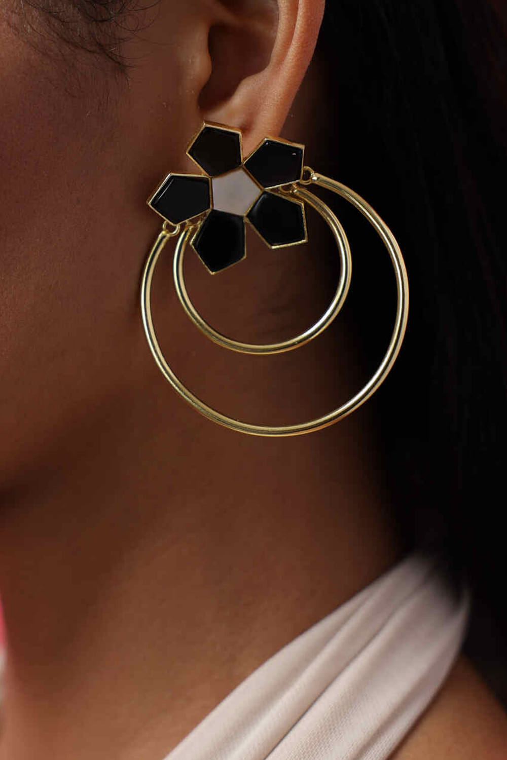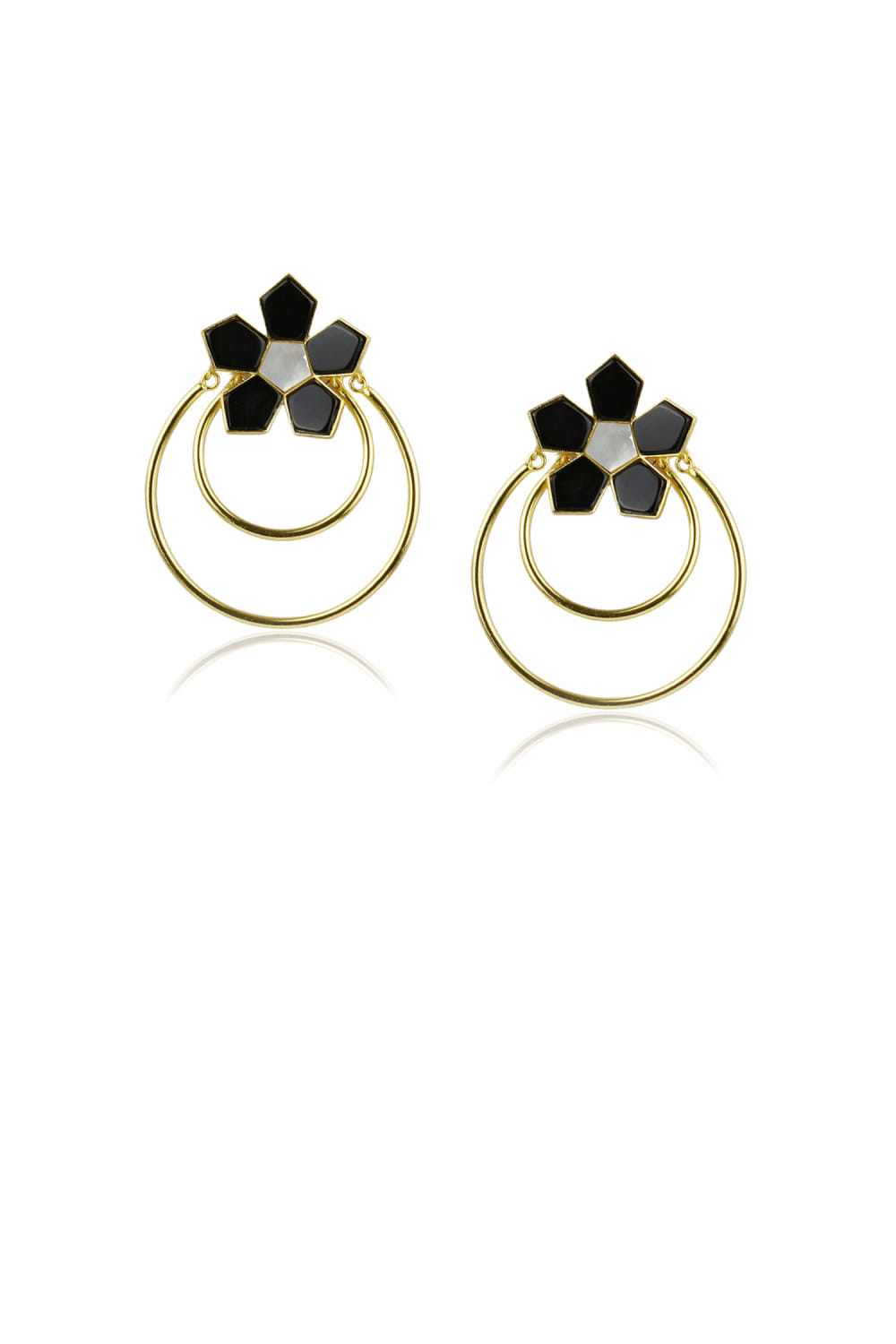 Varnika Arora designs this eye-catching pair of earrings with enamel and mother-of-pearl embellishment featuring floral studs and a layered round ring pattern crafted in 22K gold plating. Style them with a halter dress for a vacation vibe.