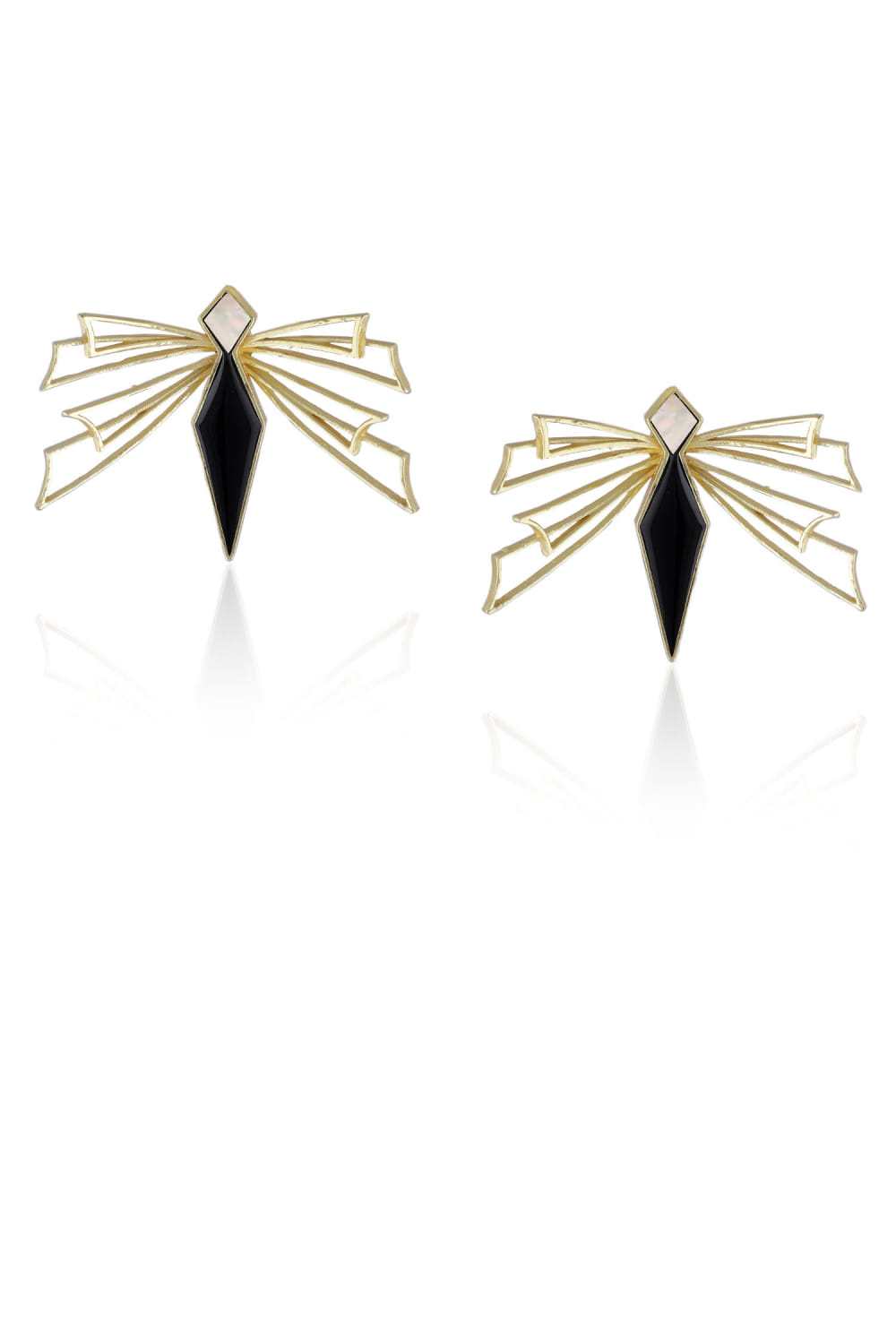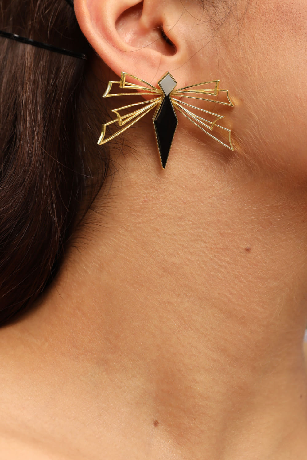 Varnika Arora designs this pair of chic earrings inspired by dragonfly, customised in gold plating, embellished with mother of pearl and enamelled work. Style them with a statement top for a party.