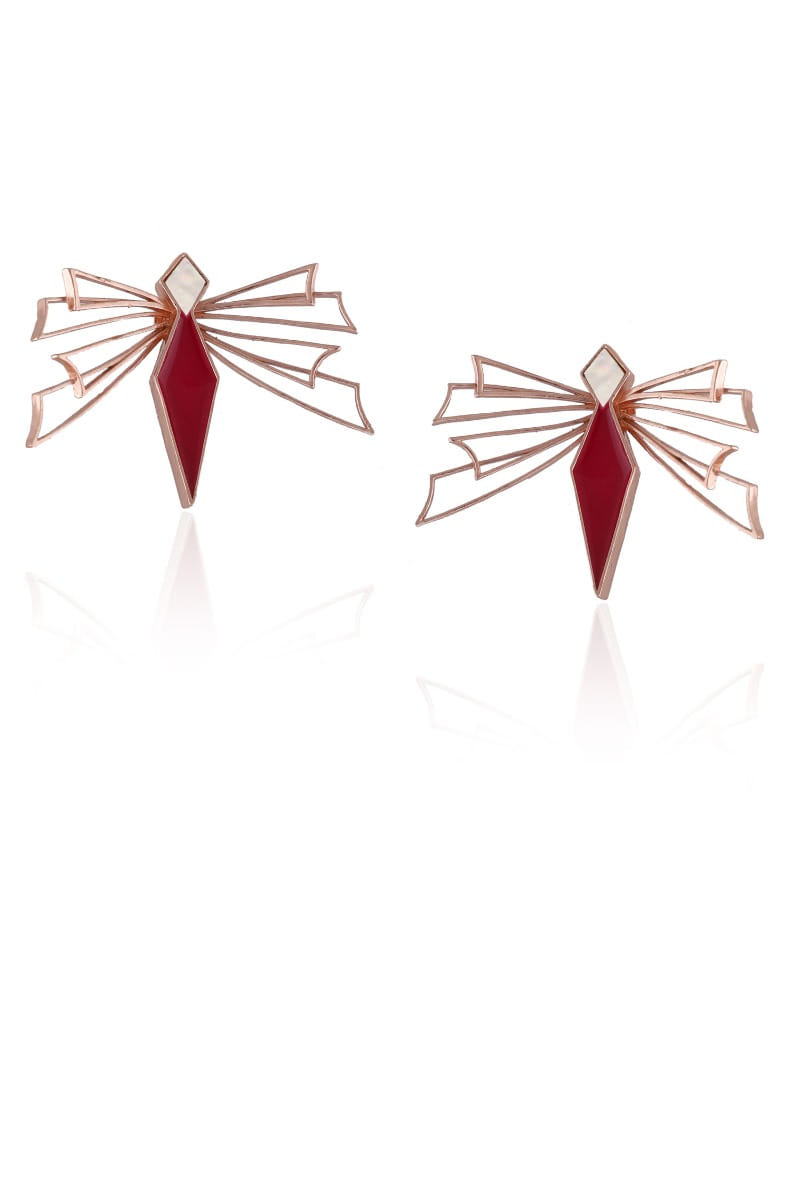 Varnika Arora designs this pair of statement-making earrings inspired by dragonfly, customised in rose gold plating, embellished with mother of pearl and enamelled work. Style them with a printed dress.