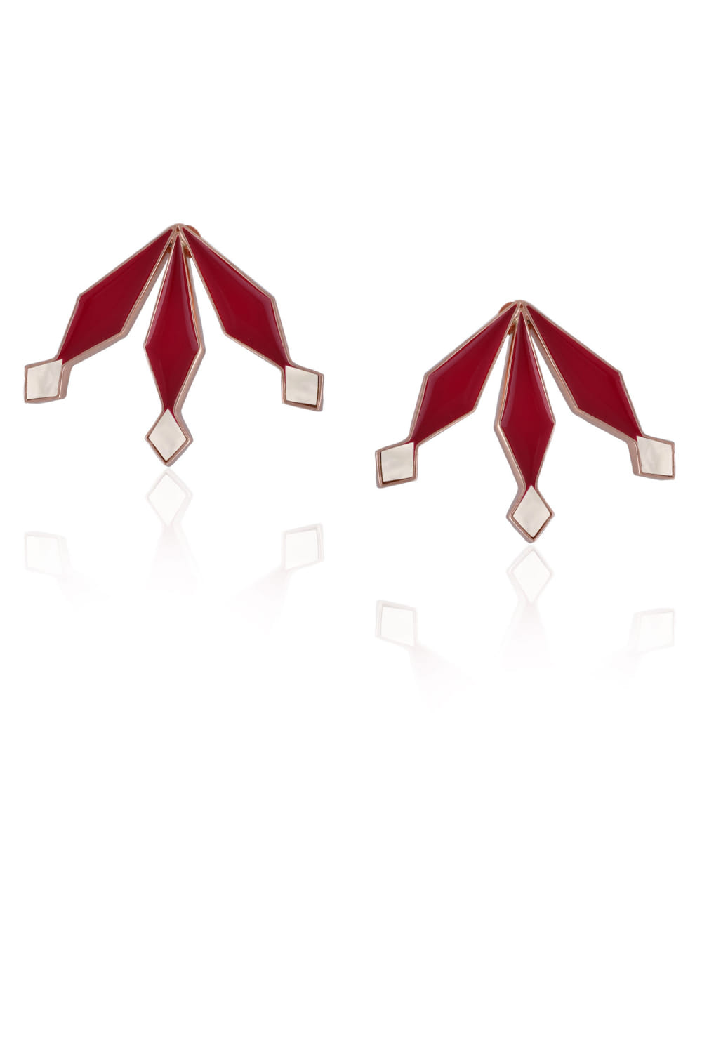 Varnika Arora designs this pair of timeless pair off-half geometric floral earrings customised in gold plating, featuring mother of pearls and black enamel work. Complement them with a white dress to make a statement.