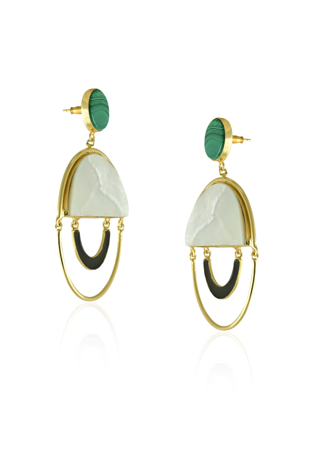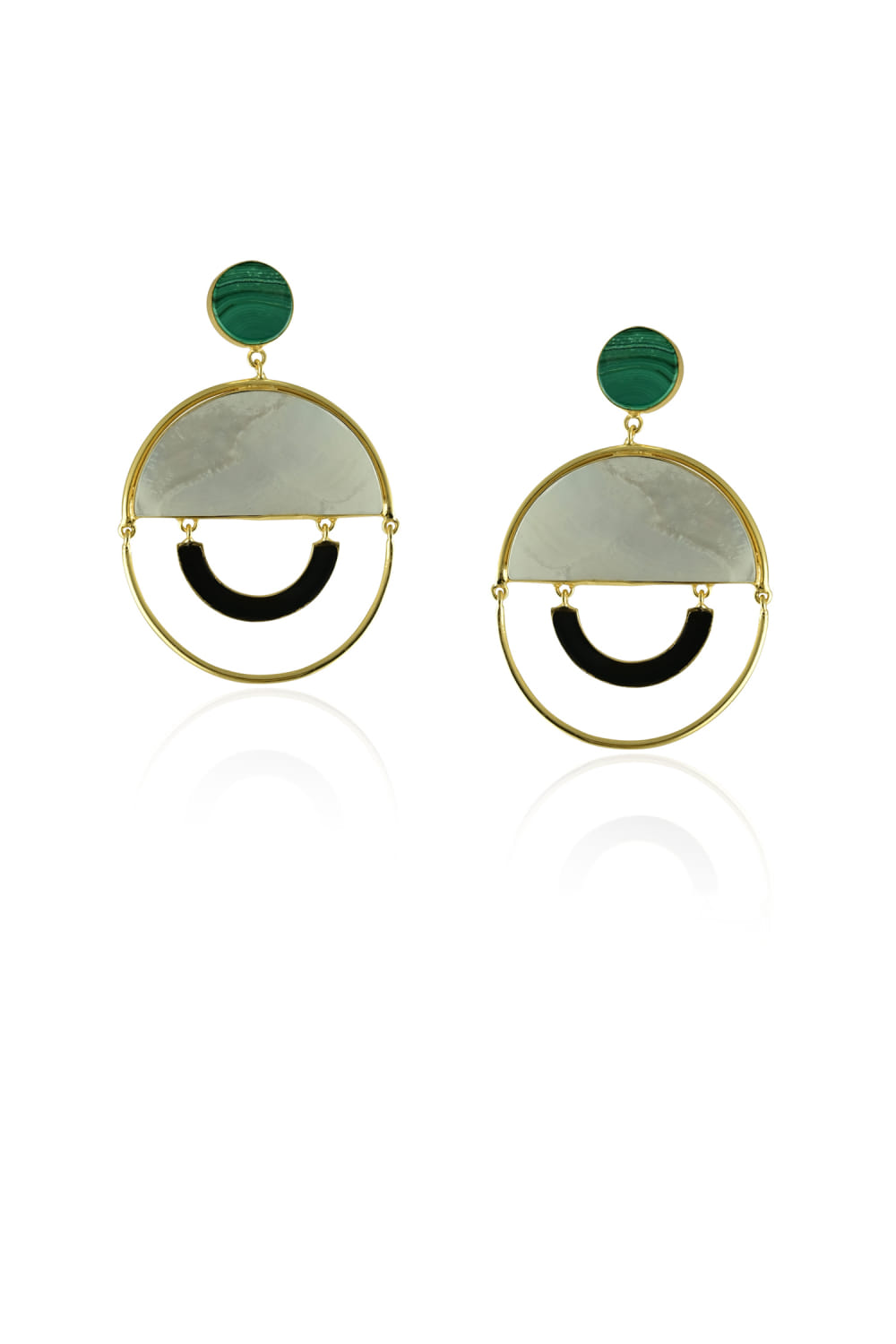 Varnika Arora designs this timeless pair of earrings in 22kt gold plating laden with malachite, mother of pearl and black enamel work in circular shapes. Accessorise them with a flared dress for a weekend brunch.