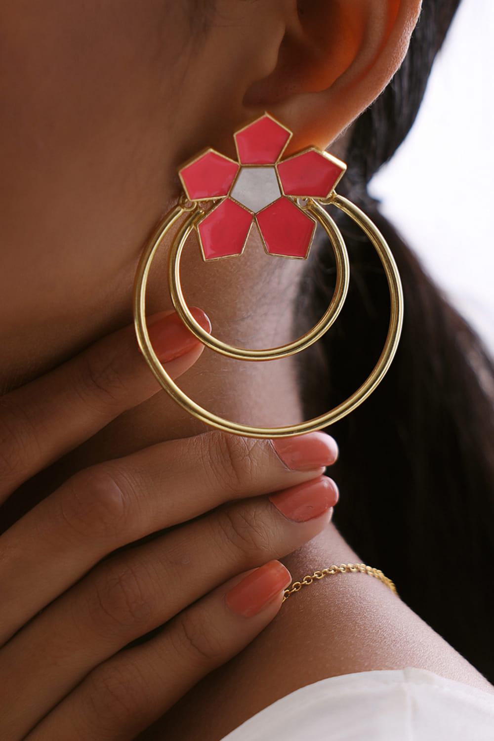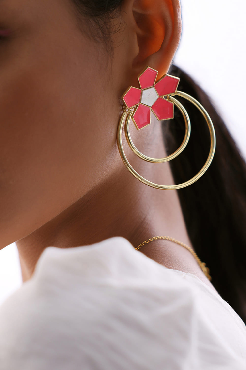 Varnika Arora designs this vacation-ready pair of earrings embellished with enamel and mother-of-pearl detailing featuring a floral stud and layered round rings pattern crafted in 22K gold plating. Style them with a kaftan ensemble for the festive.