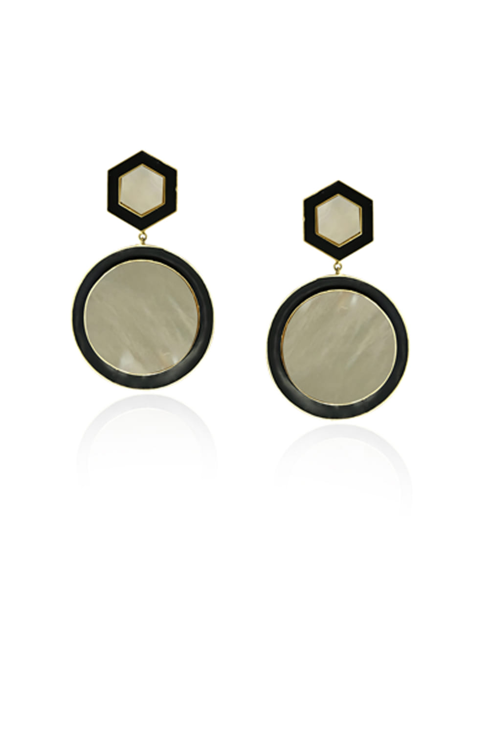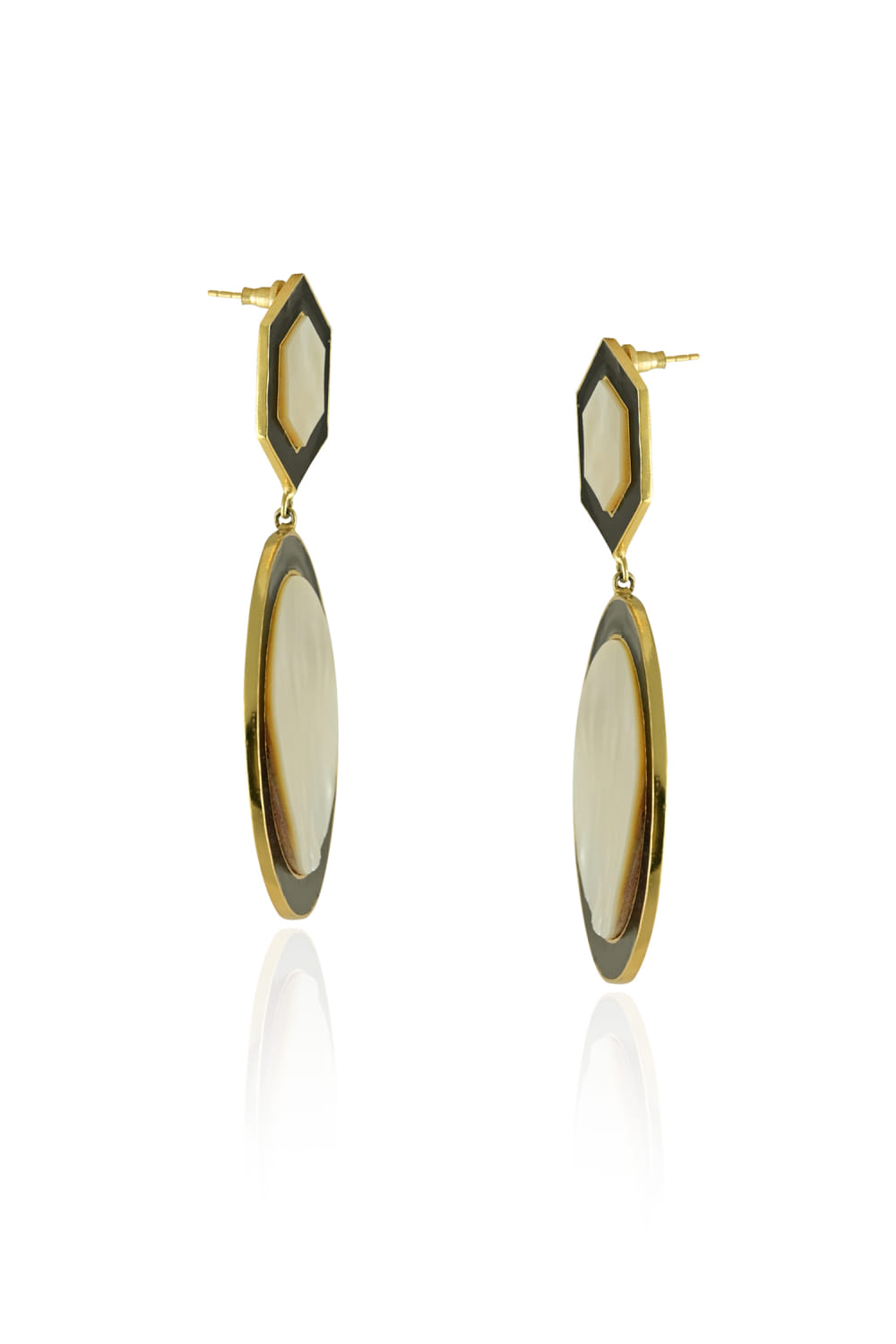 Varnika Arora designs this statement pair of 22kt gold-plated earrings customised in geometric shapes with white enamel work and black onyx. Style them with a jacket set to make heads turn.