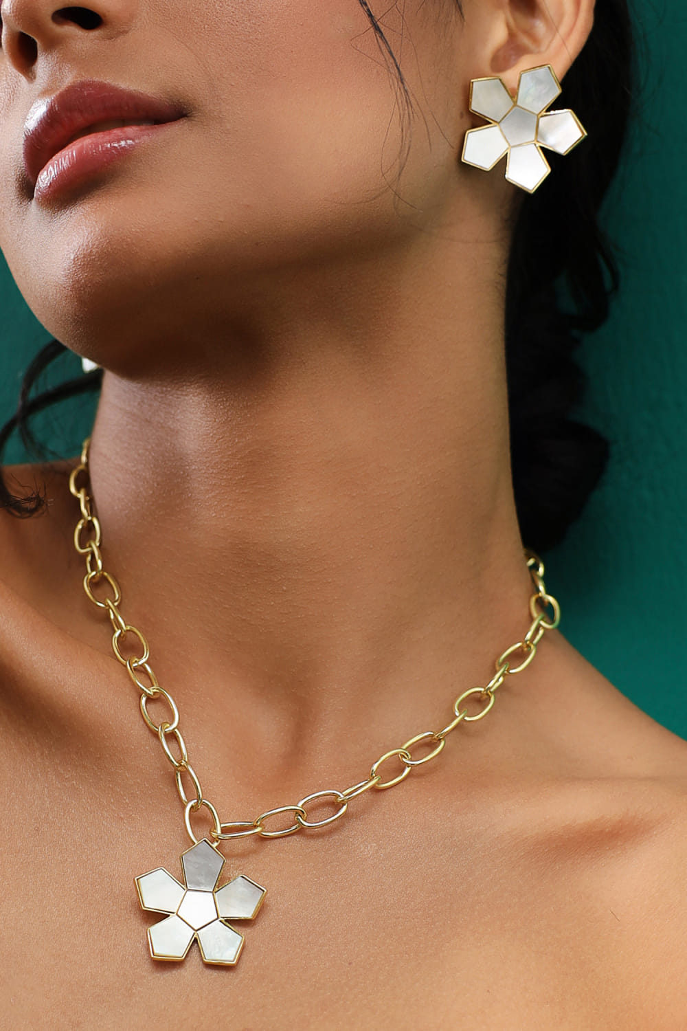 Varnika Arora designs this alluring pair of stud earrings customised in 22K gold plating enriched with mother-of-pearl detailing featuring a floral pattern. Style them with a kurta ensemble for a lunch date.