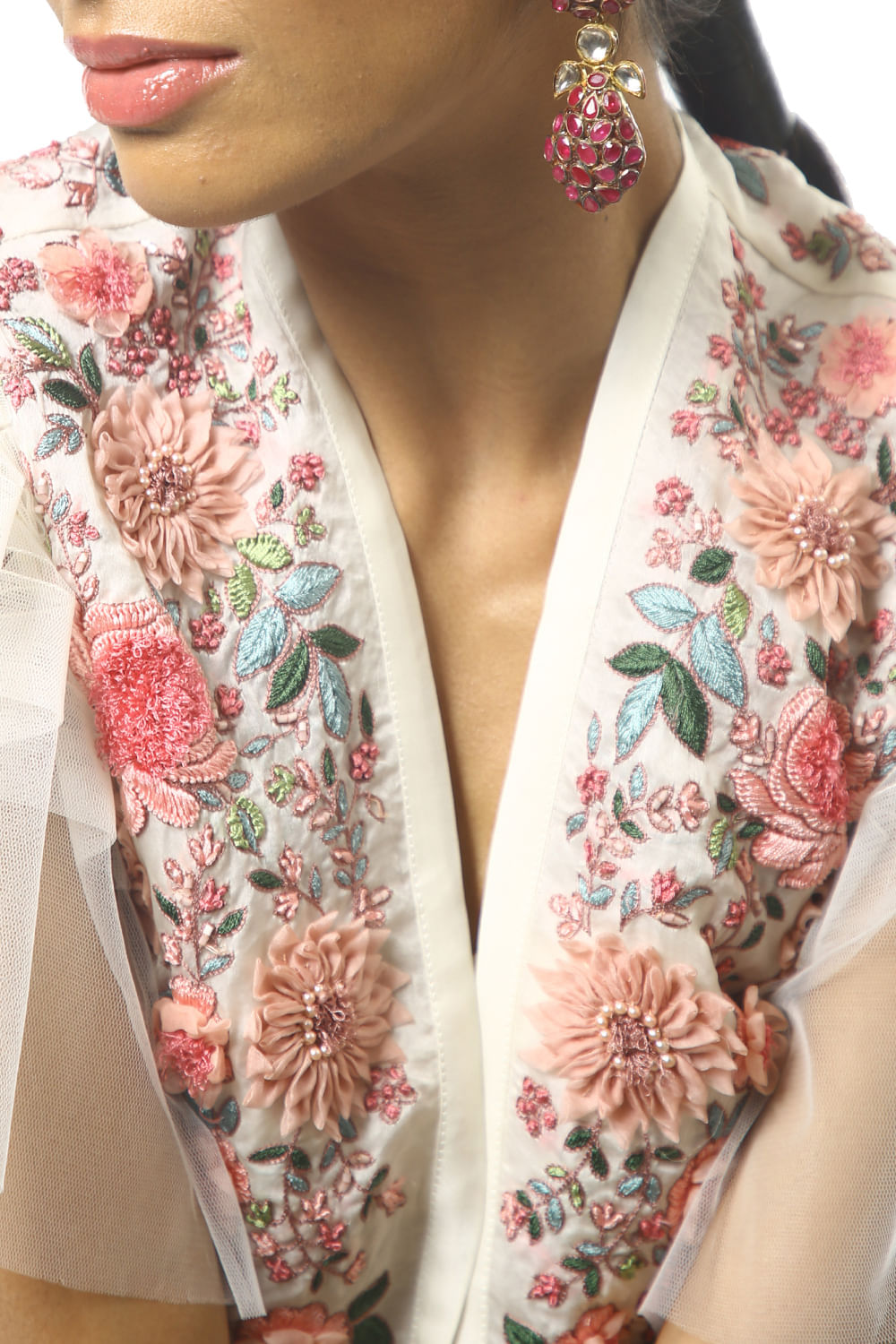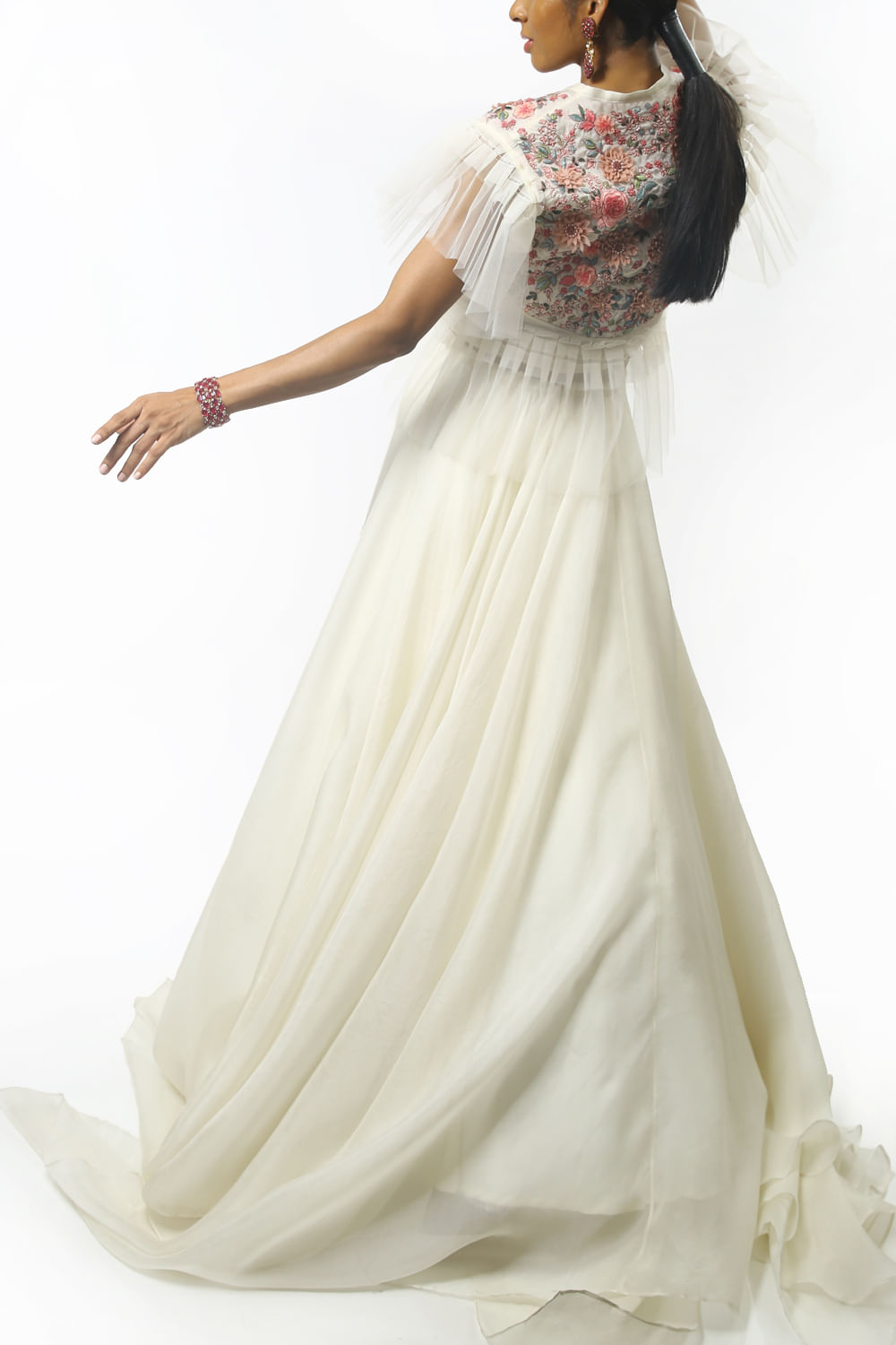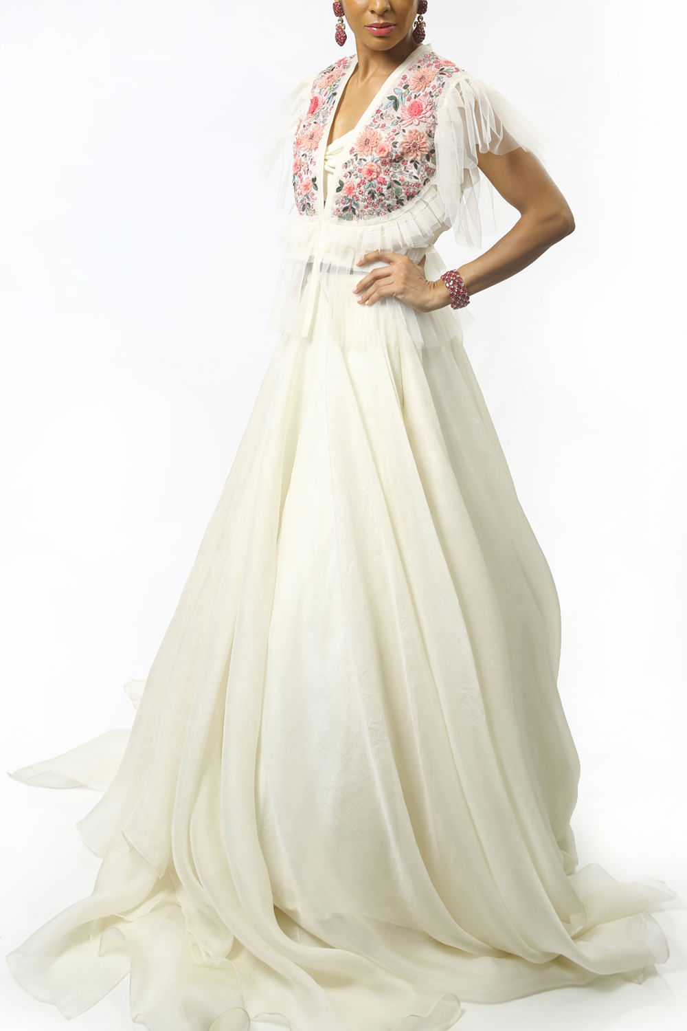Varun Bahl designs this resplendent ivory ruffled cape with multicoloured resham and 3d floral embroidery with ruffle detail on the waist and sleeves paired with a satin bustier and beautifully draped organza lehenga. Style the look with chandelier earrings.