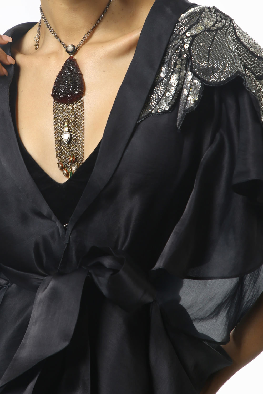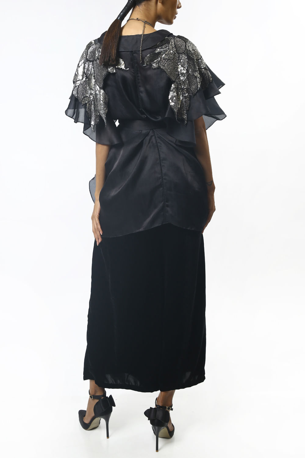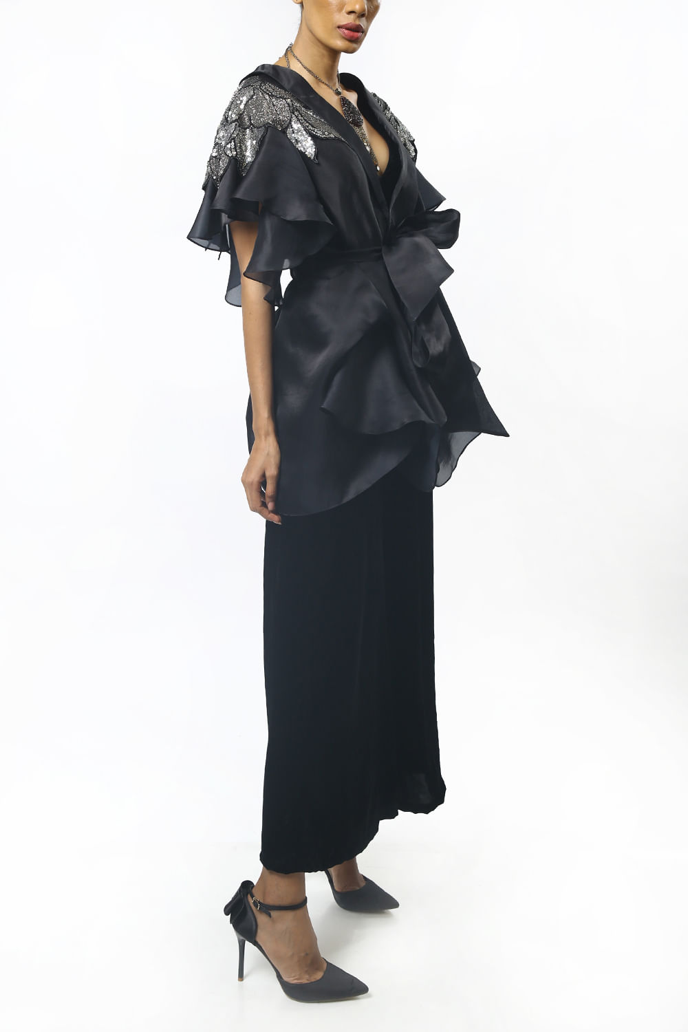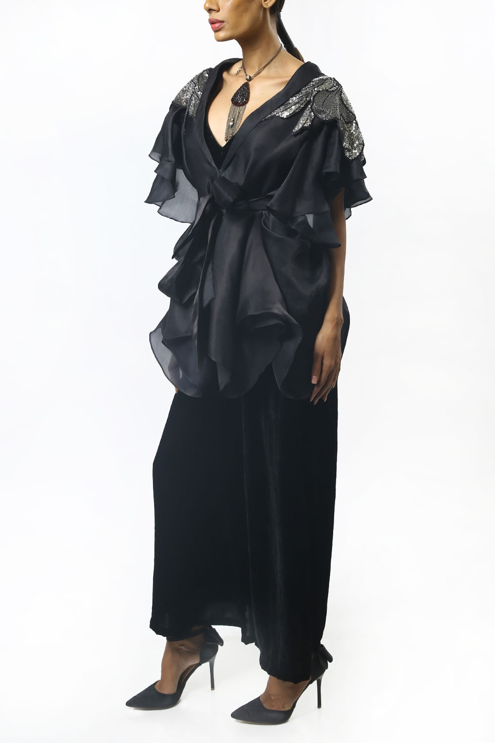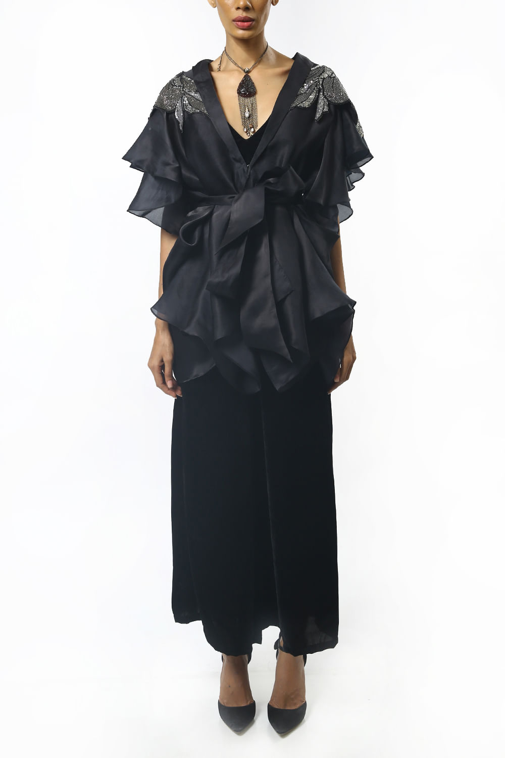 Varun Bahl designs this exquisite sheer cape with floral sequin embroidery detail on the shoulders and a front tie-up detail, this beautiful cape is paired with velvet bustier and pants. Style the look with an embellished clutch.