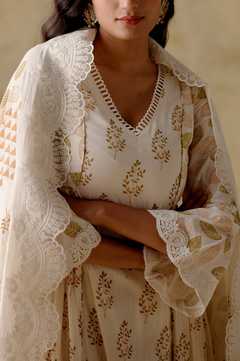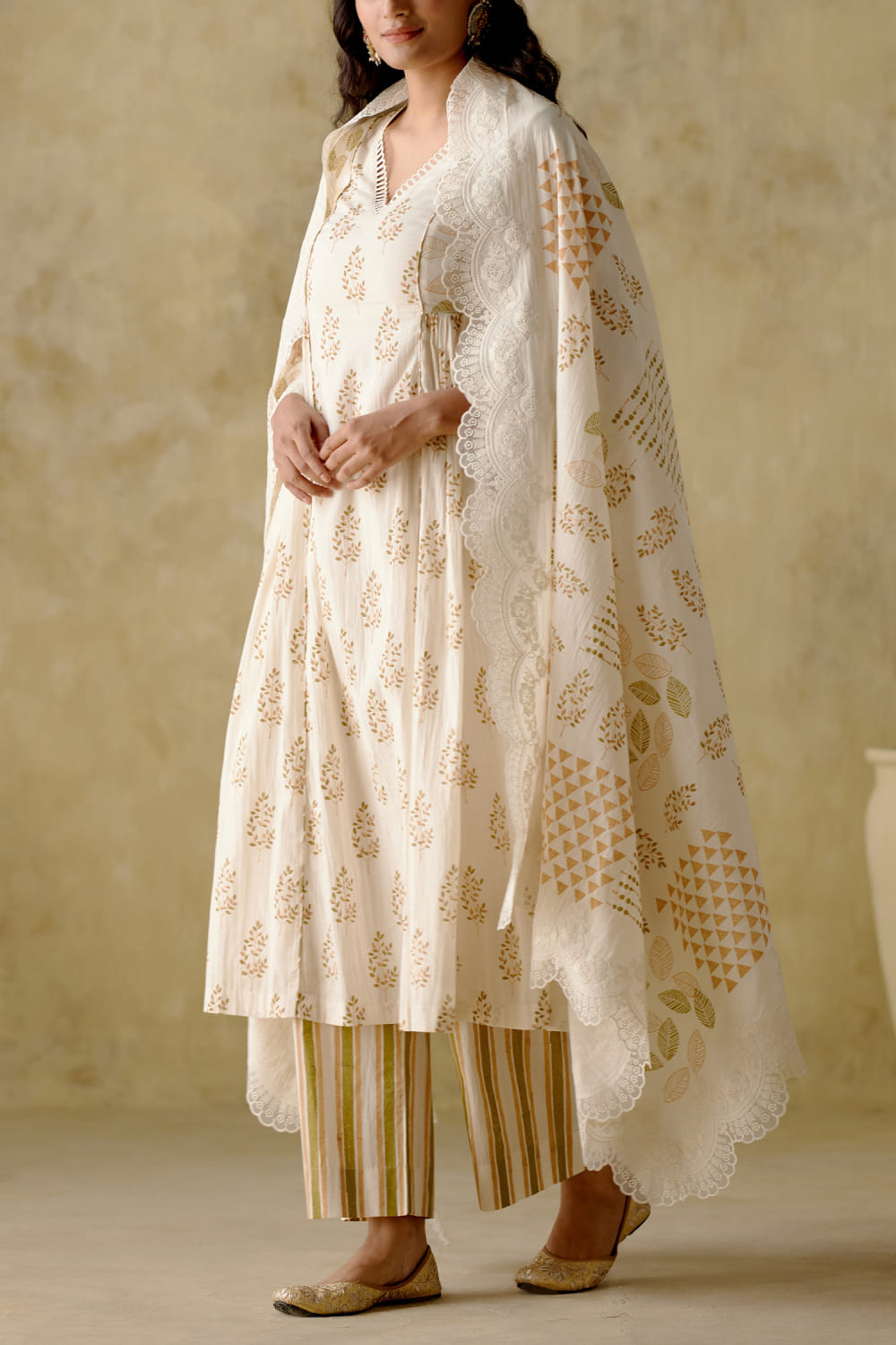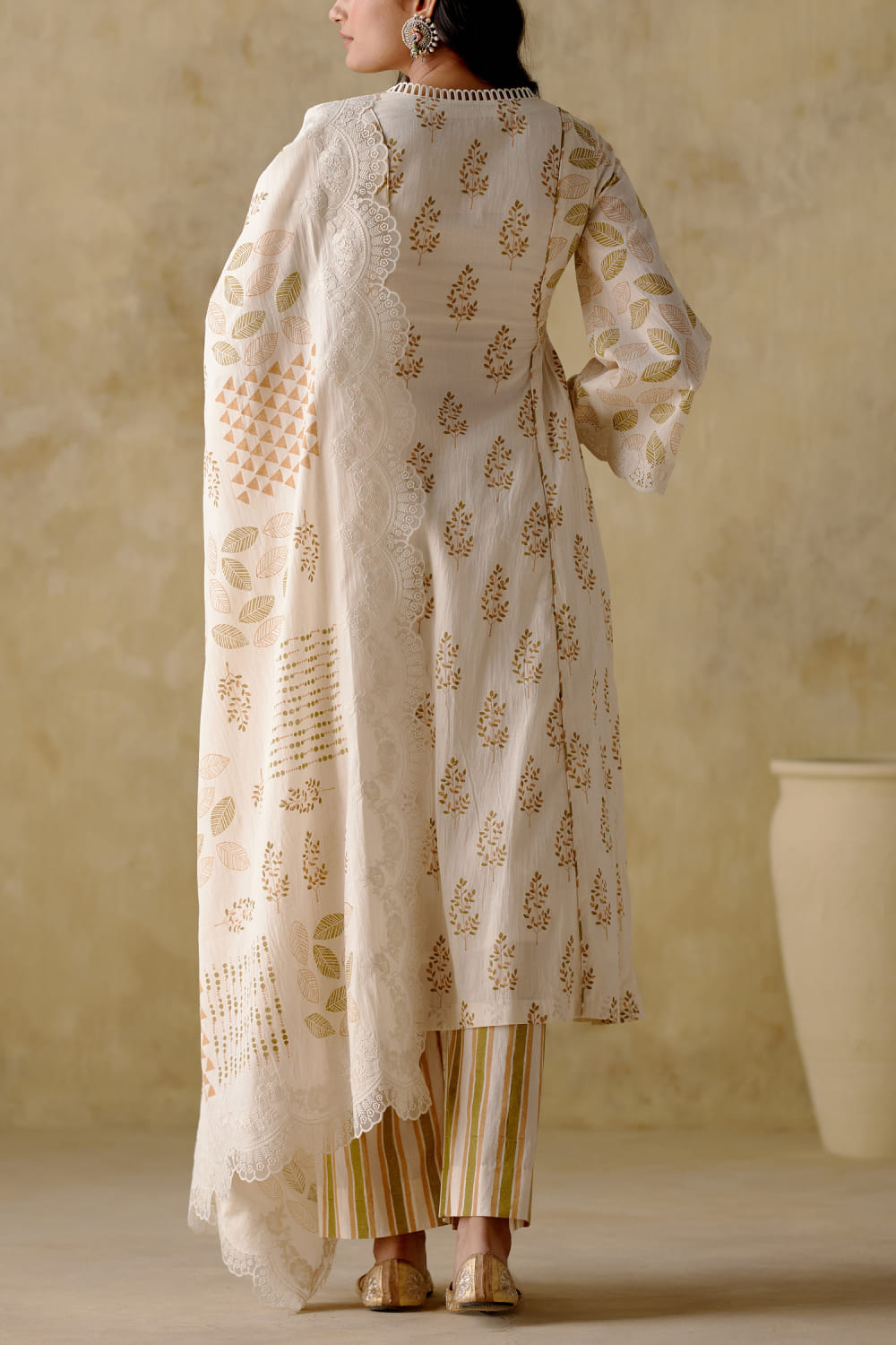 Varun Chhabra designs this statement-making kurta embraced in mulmul cotton with side pleated detailing and lace work on the neck and sleeves in leaf block prints, teamed with matching stripe block printed pants and a matching printed scalloped dupatta. Style the look with pearl drop earrings and mule block heels for pre-wedding festivities.