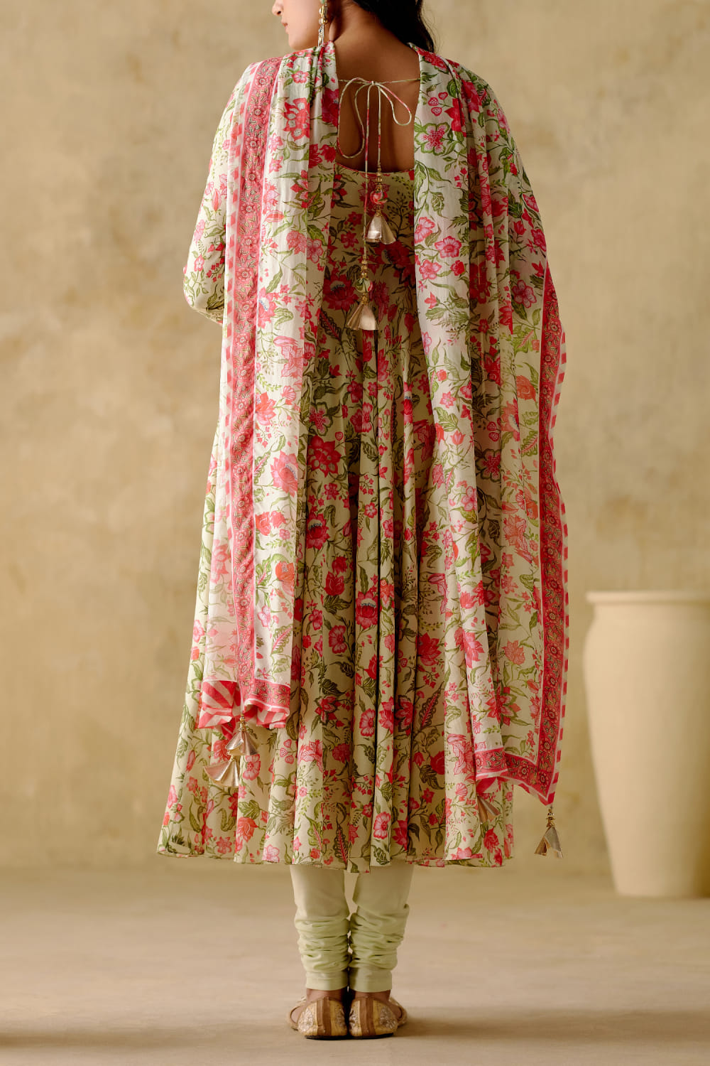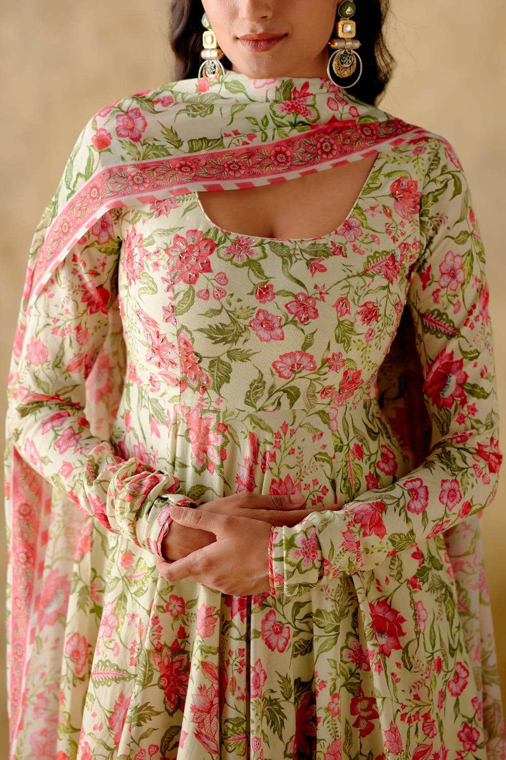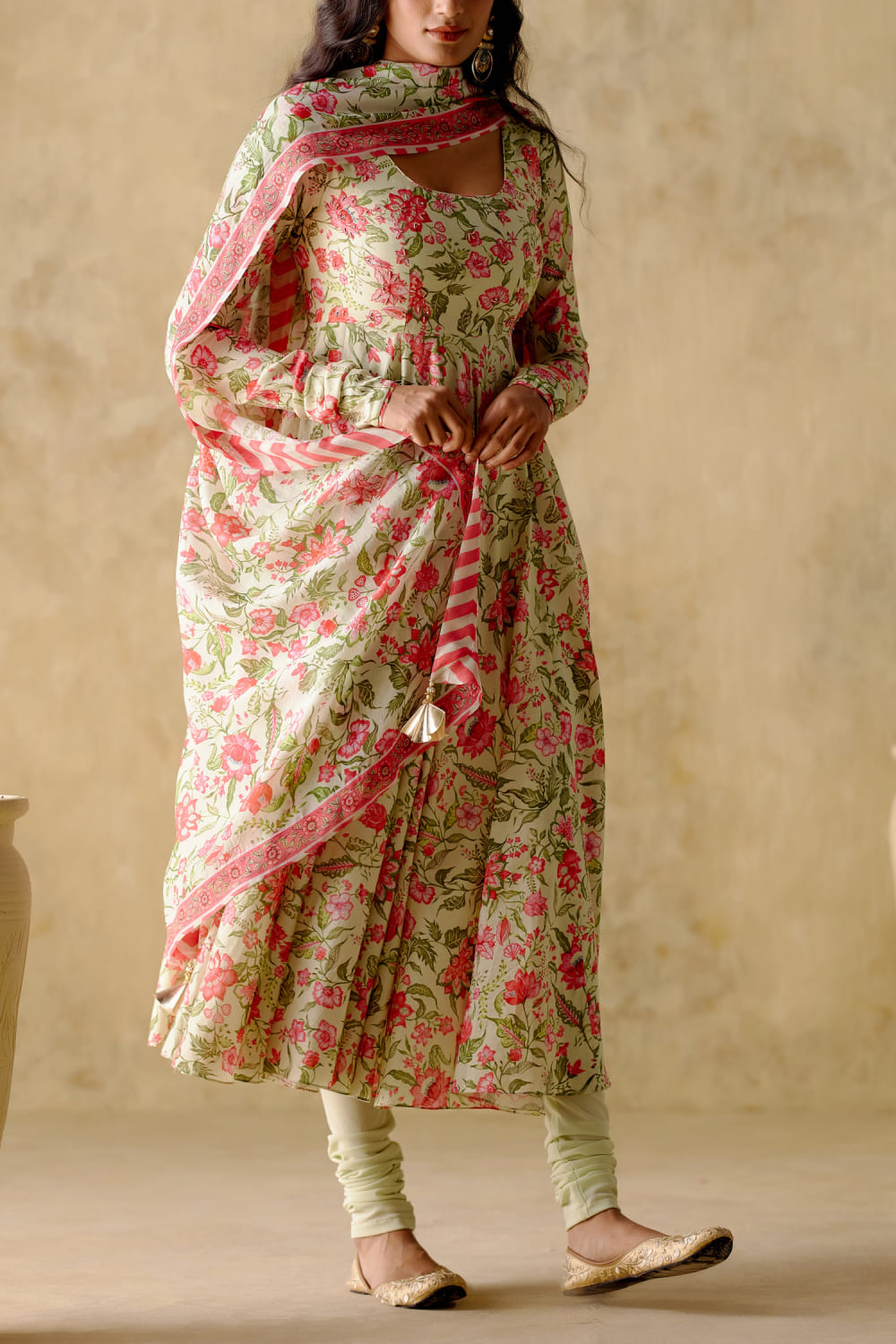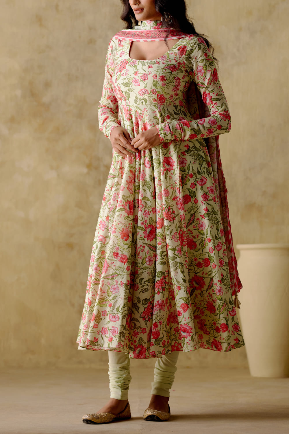 Varun Chhabra designs this enchanting anarkali embraced in chanderi silk with churi sleeves, delicate sequins and zari hand embroidery in floral digital prints, complementing it with a matching printed chiffon dupatta and a matching lycra churidar. Style the look with polki earrings and mule block heels for a festive affair.