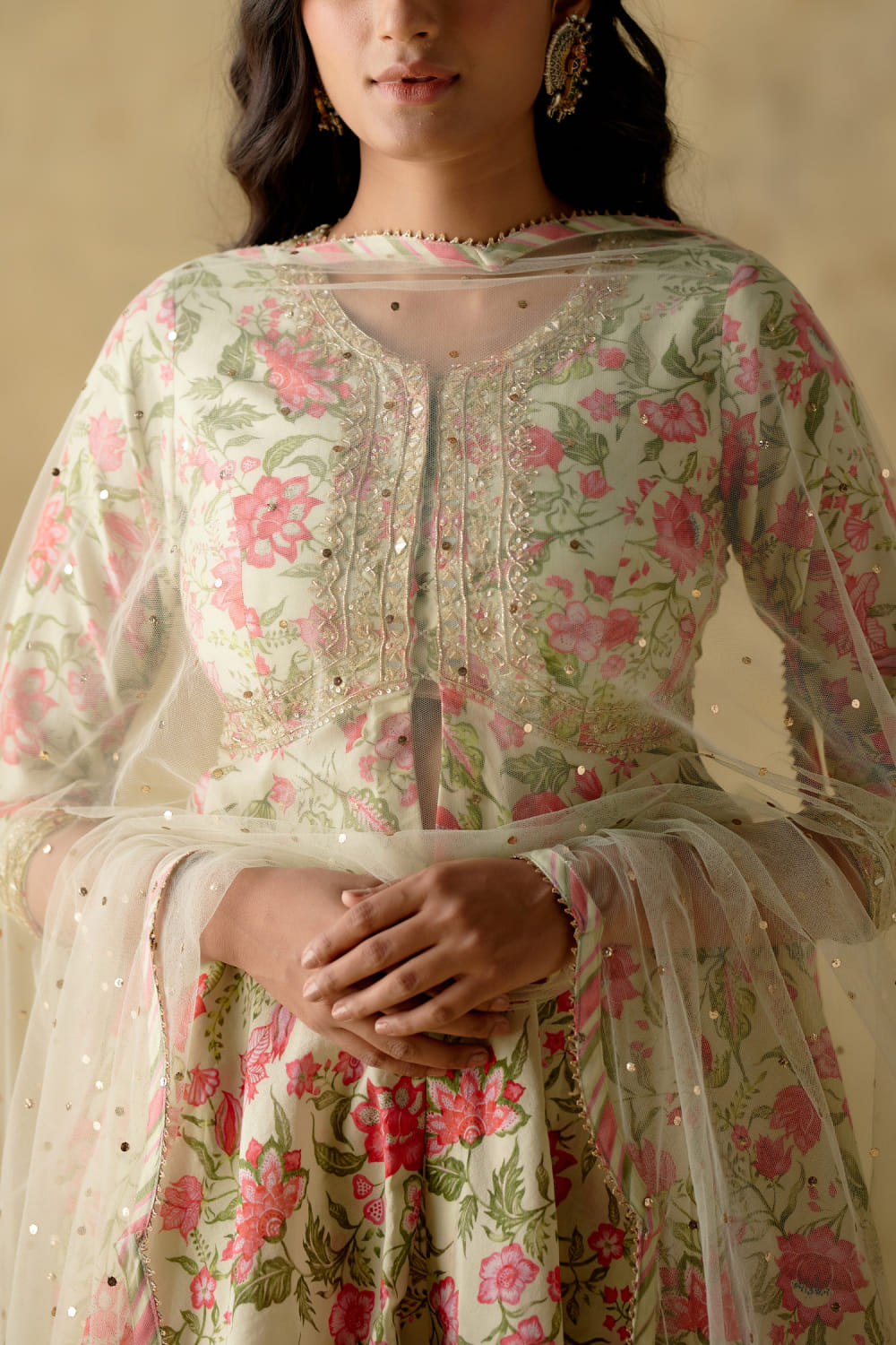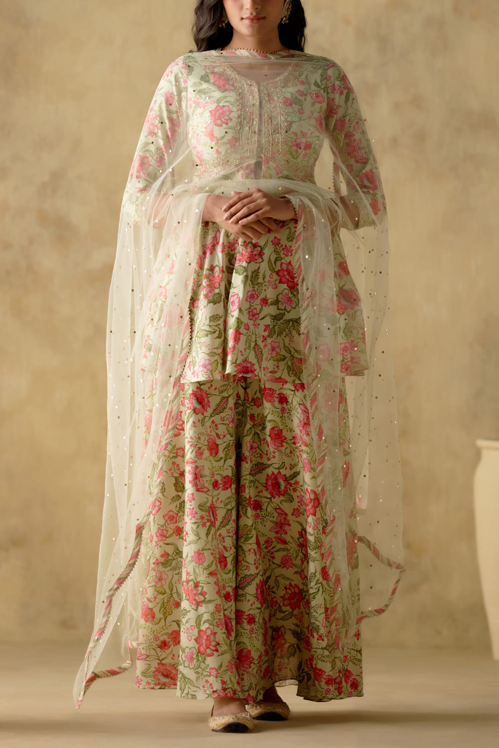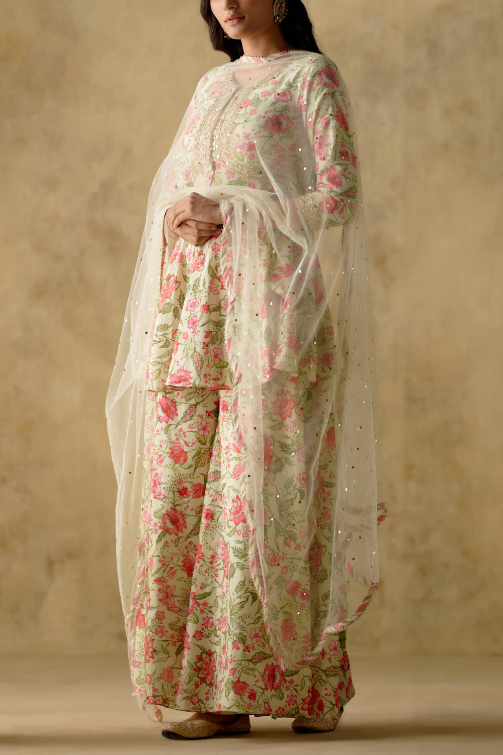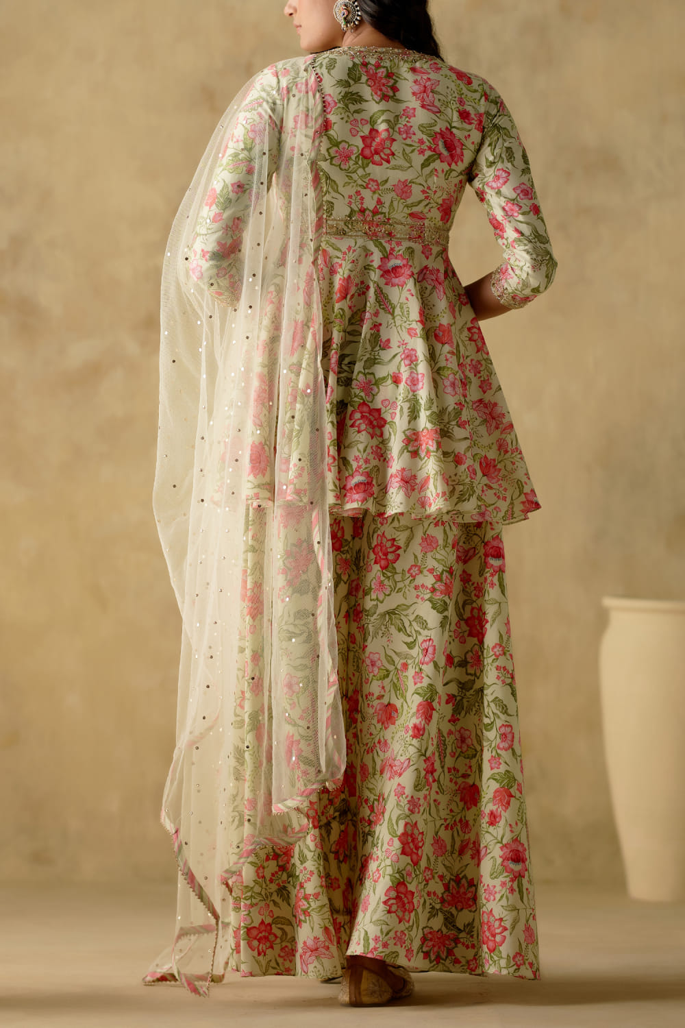 Varun Chhabra designs this exquisite peplum customised in chanderi silk with delicate sequins, mirror, zari and dabka embroidery in floral digital prints, pairing it with a matching printed sharara and a mukaish embellished net dupatta. Style the look with kemp stone studs and embellished juttis for a pre-wedding affair.