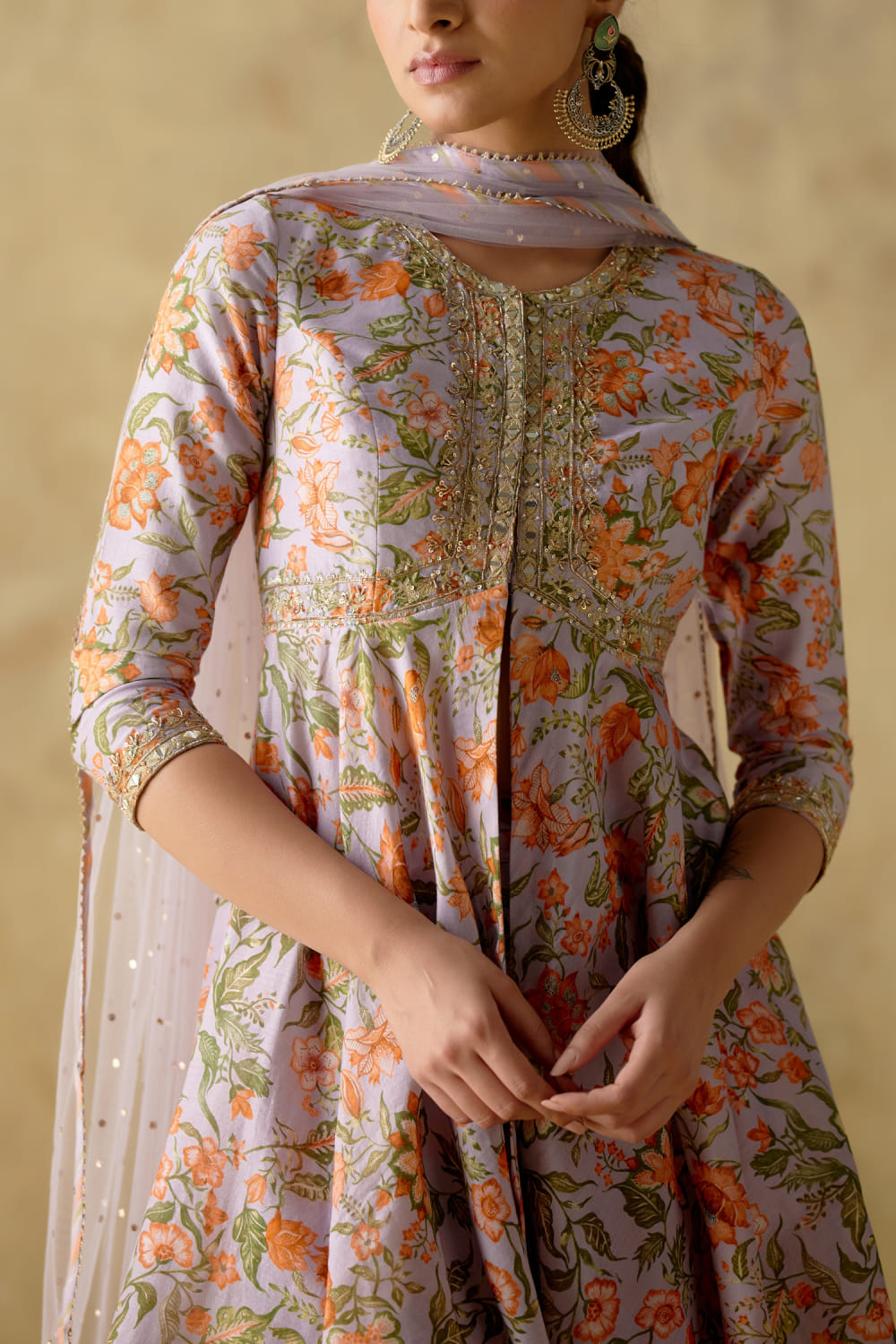 Varun Chhabra designs this stunning peplum in chanderi silk enriched with delicate sequins, mirror, zari and dabka embroidery in floral digital prints, teamed with a matching printed sharara and a matching mukaish embellished net dupatta. Style the look with embellished chandbaalis and kolhapuri wedges for a festive occasion.
