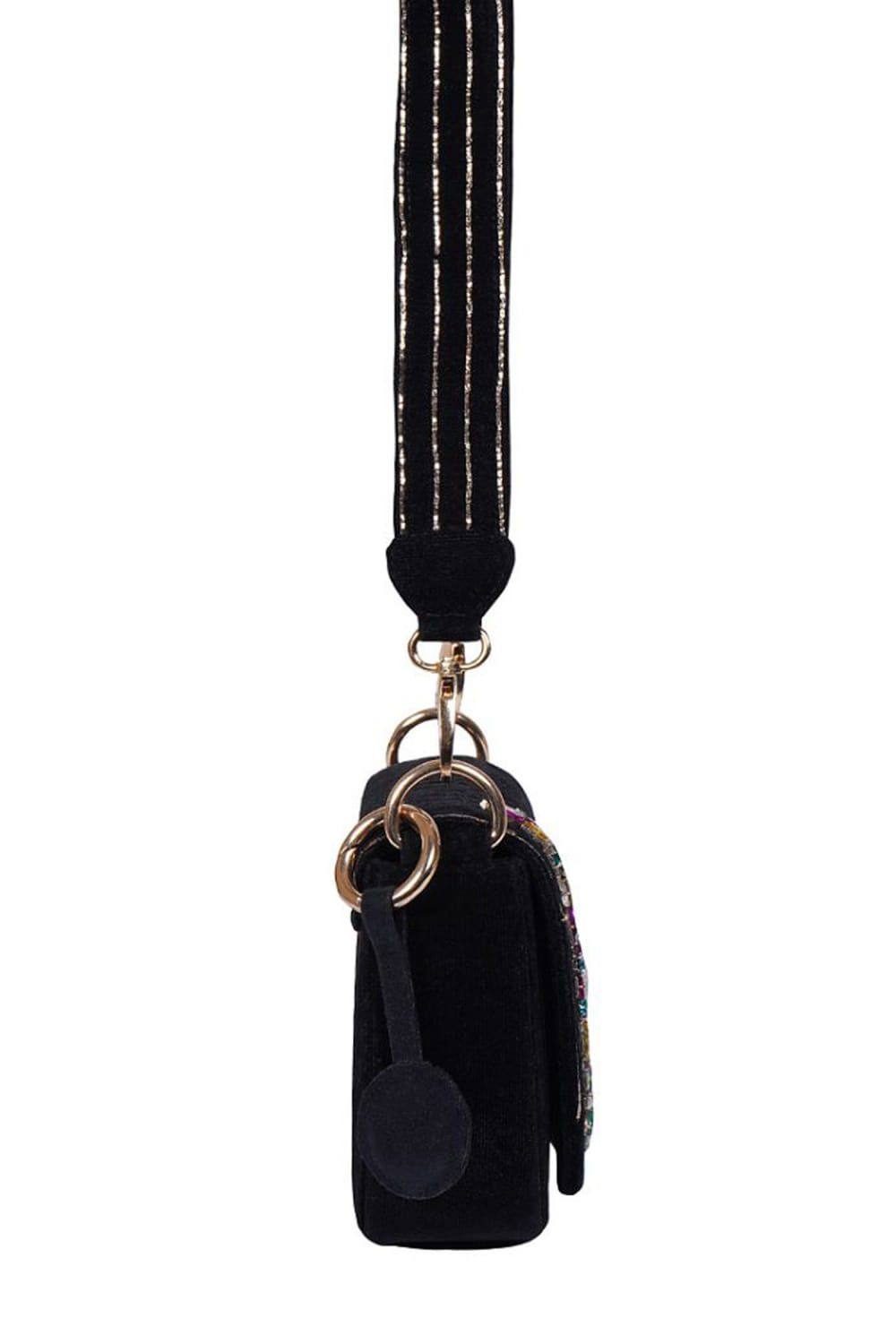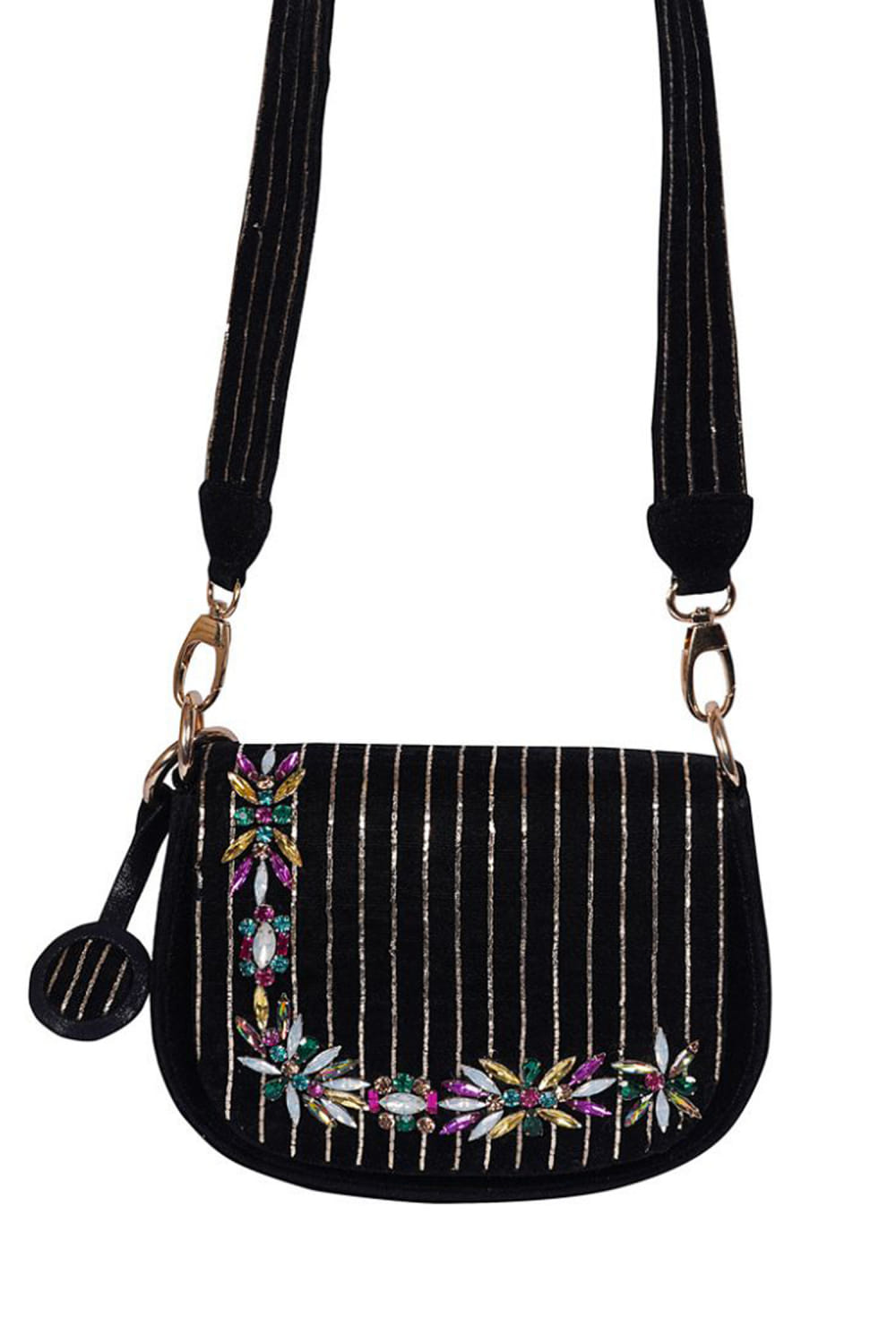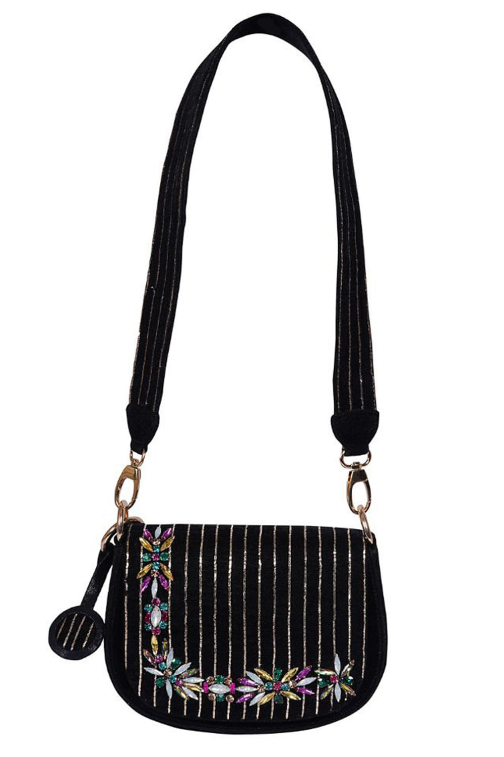 Veruschka designs this contemporary saddle bag customised in suede with antique gold pitta embroidery and multicoloured crystal embellishments featuring a detachable shoulder strap. Style it with a draped skirt set for a stylish look.