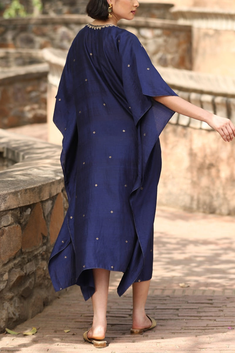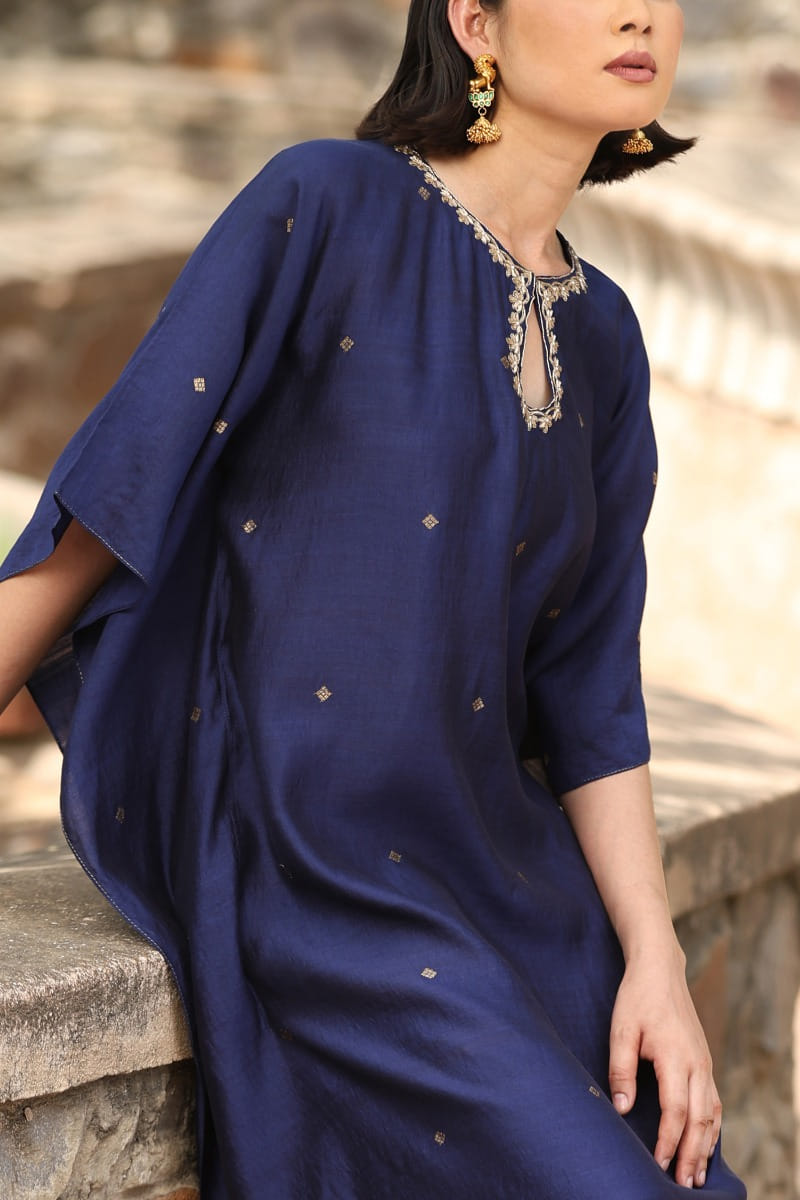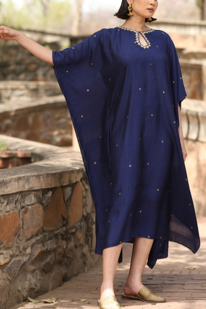 Weaver Story designs this timeless kaftan customised in handloom pure silk with geometrical woven motifs featuring metallic hand embroidery in floral patterns on the neckline. Style the look with embellished chandbalis and a bucket bag for an occasion.