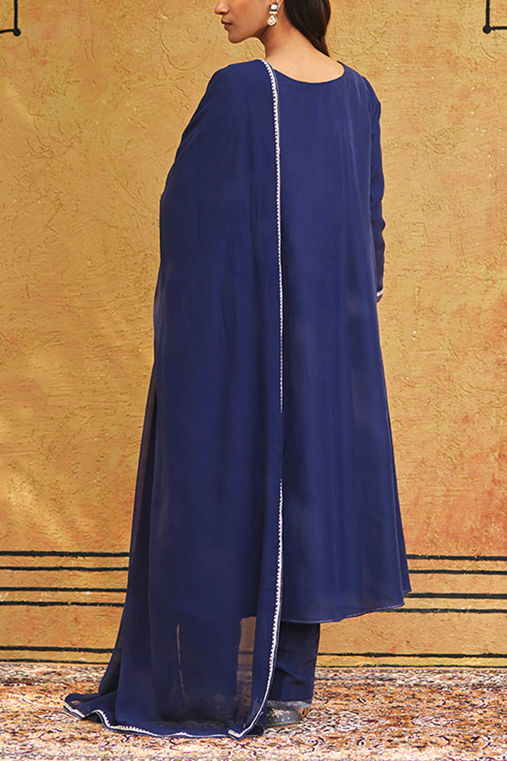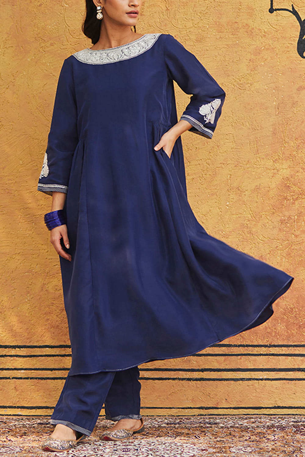 Weaver Story designs this timeless kurta customised in handwoven pure silk with intricate Kashmiri tilla hand embroidery, pairing it with matching pants and a matching dupatta. Style the look with silver earrings and an embellished ring for a classic update.
