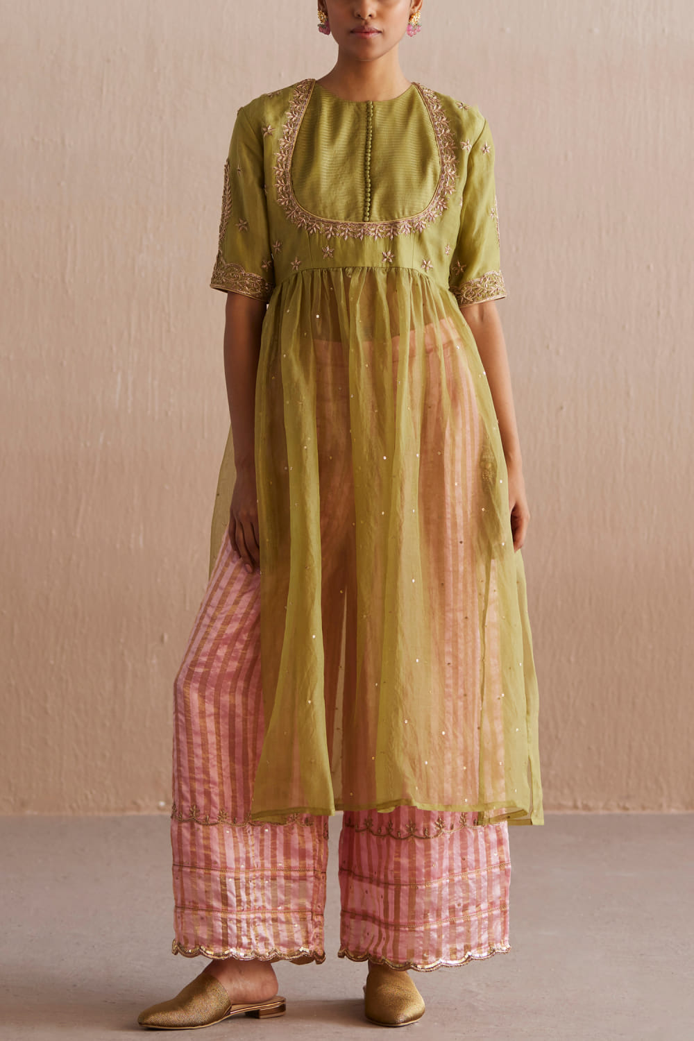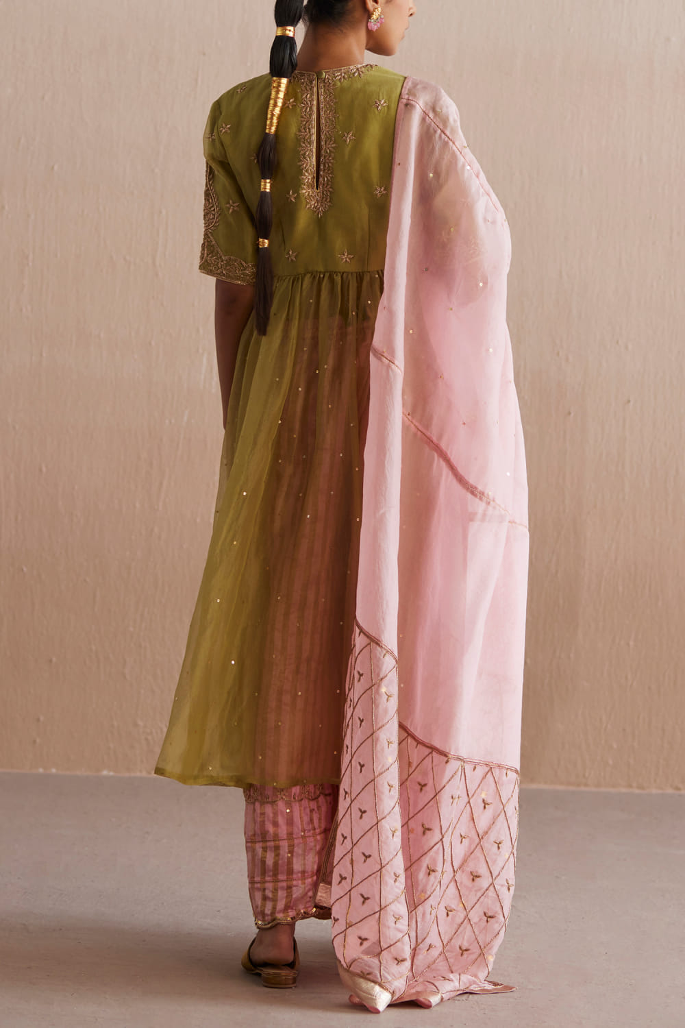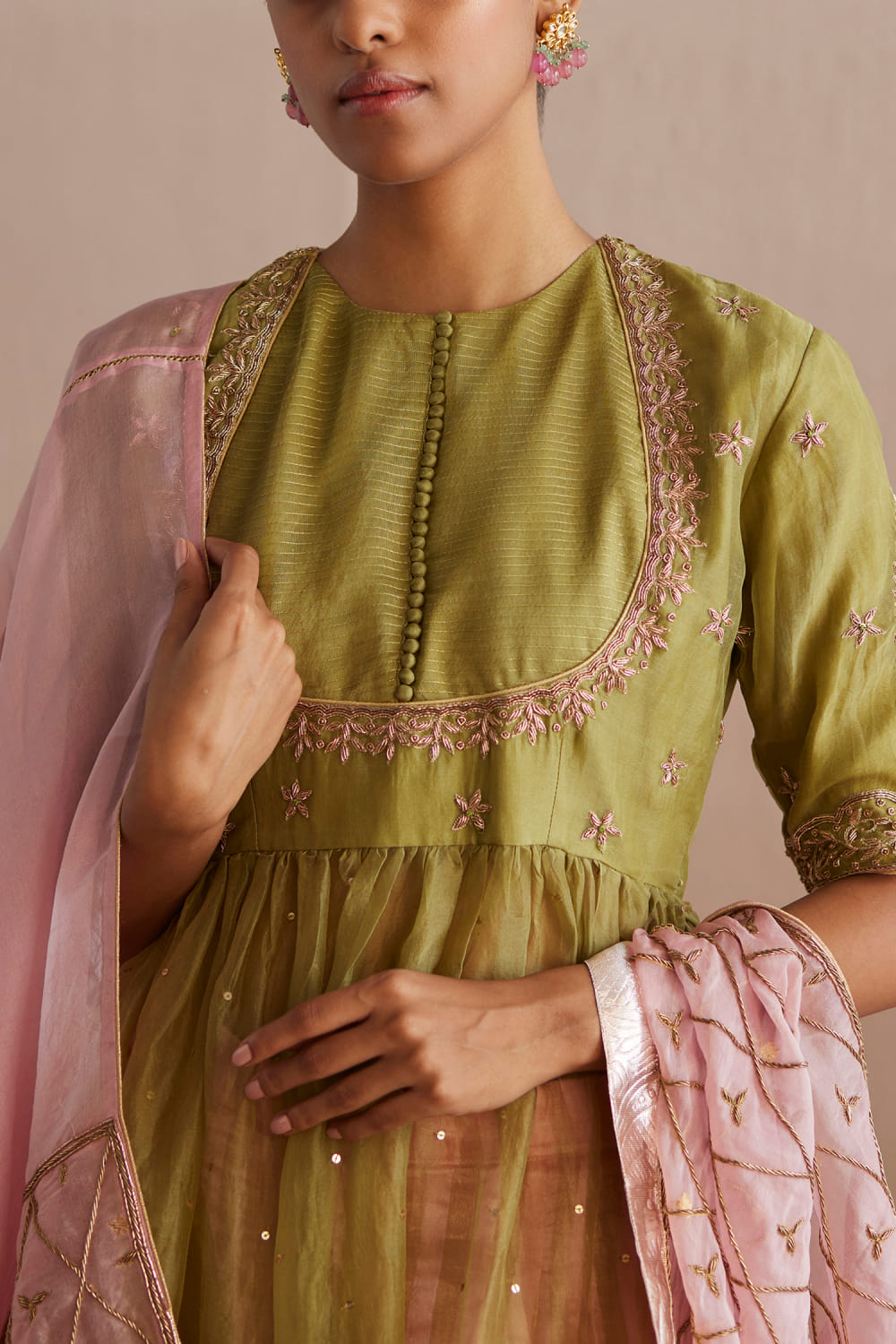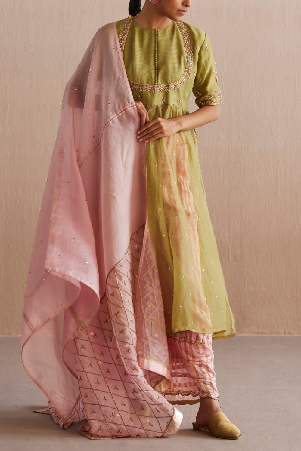 Weaver Story designs this ethnic wear kurta in cotton tissue with zari hand embroidery detailing, teamed with embellished pants and a contrasting dupatta. Style the look with a pearl choker and a cuff bracelet for the celebration.