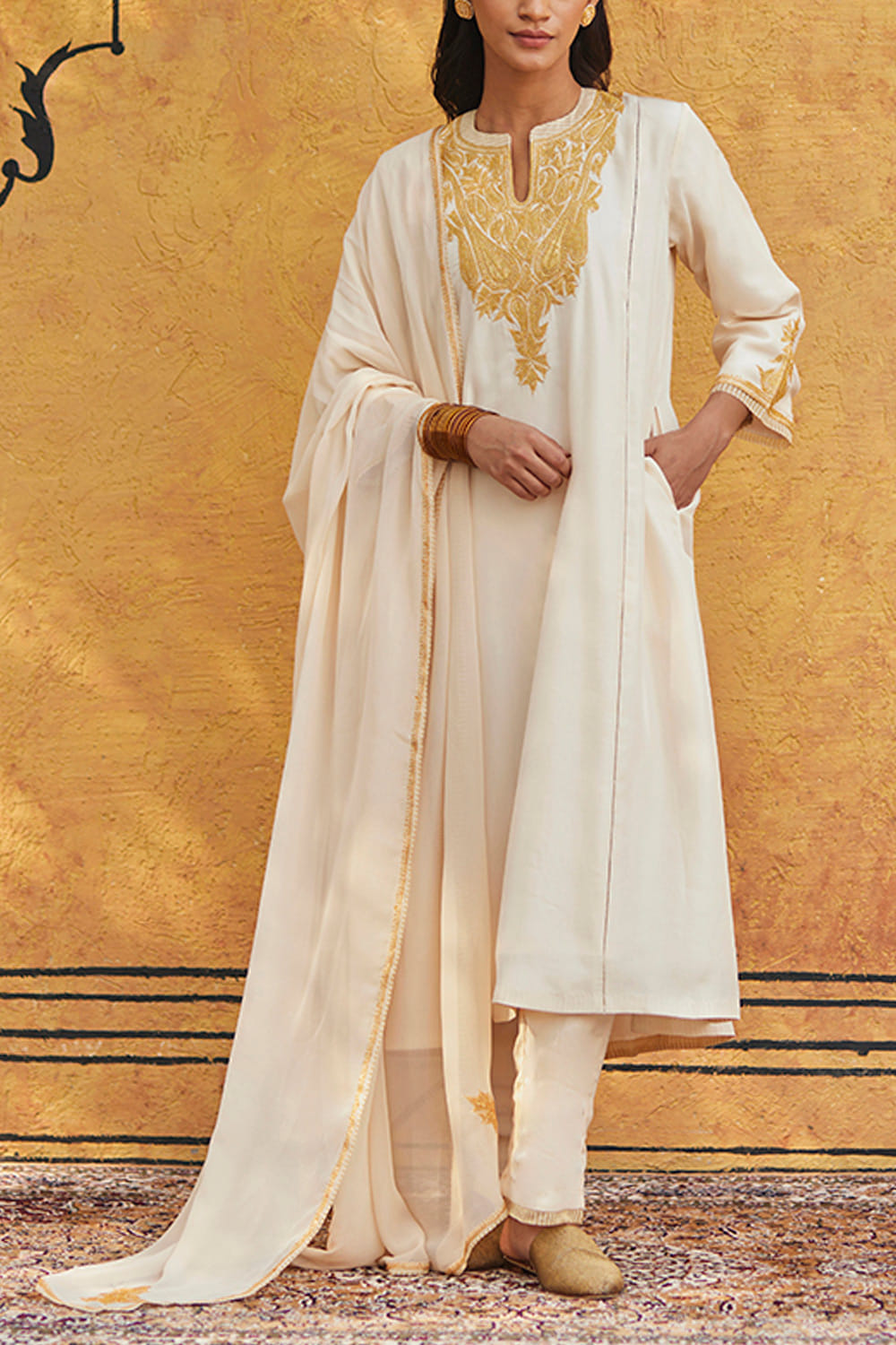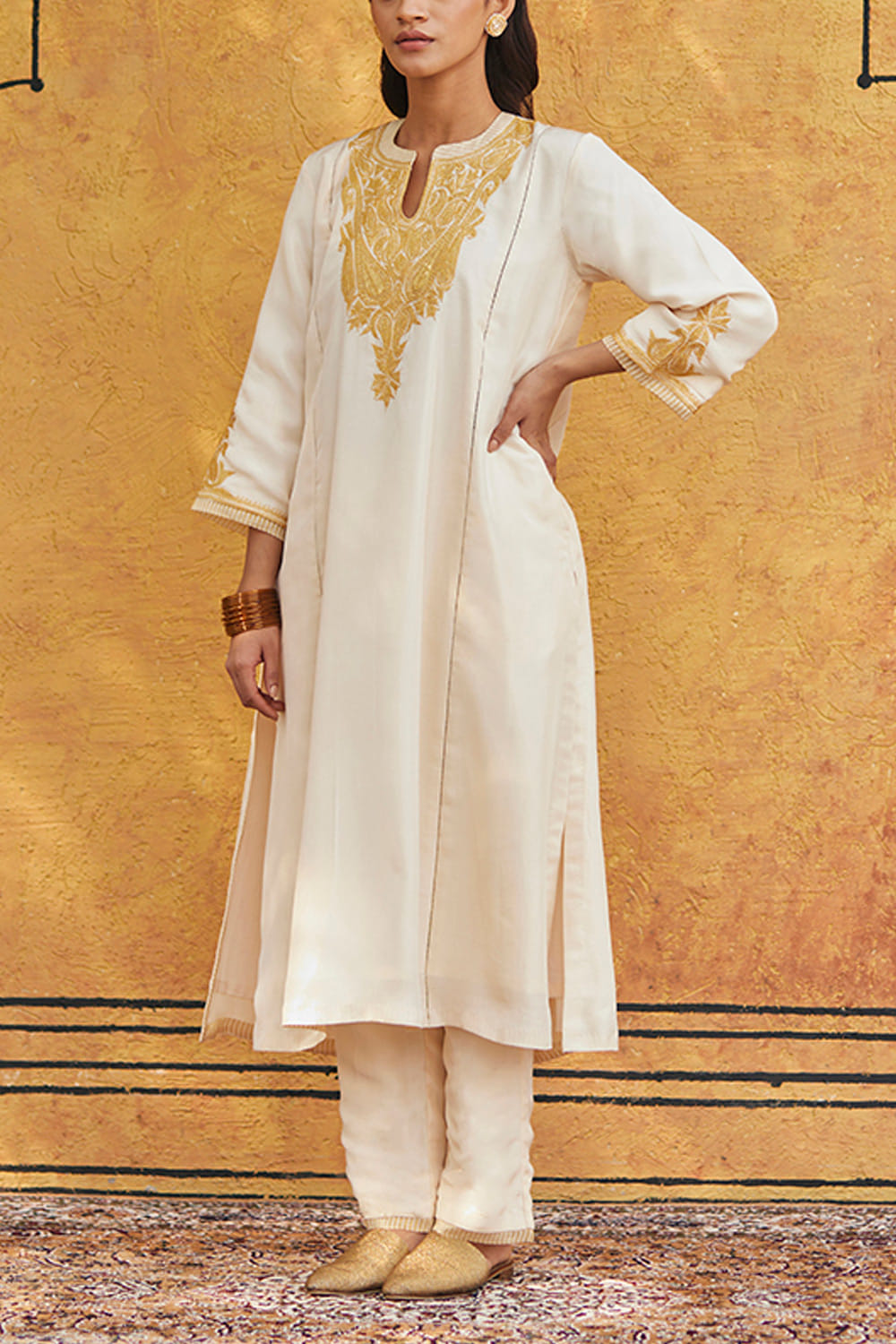 Weaver Story designs this classic kurta embraced in handwoven pure silk with intricate Kashmiri tilla hand embroidery, complementing it with matching pants and a matching dupatta. Style the look with oxidised jhumkas and kolhapuri wedges.