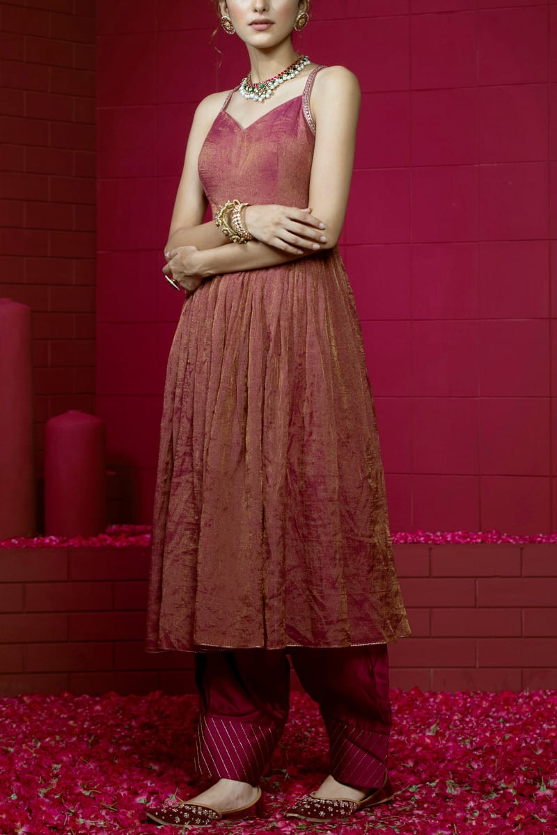 Weaver Story designs this bright strappy kurta crafts in handloom chanderi tissue with zari sequin embroidery highlights, pairing it with matching pants and dupatta. Style the look with a pearl necklace set and embellished wedges.