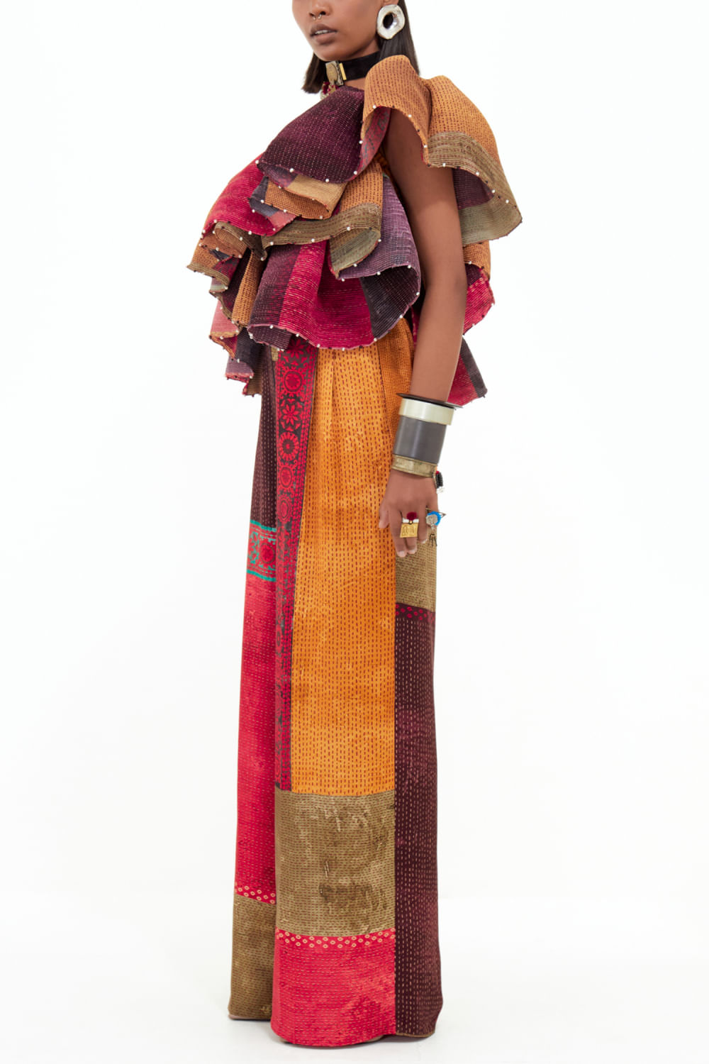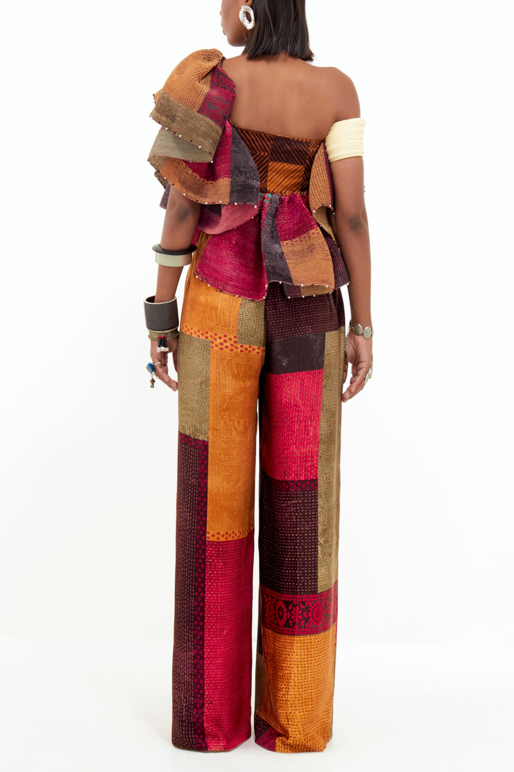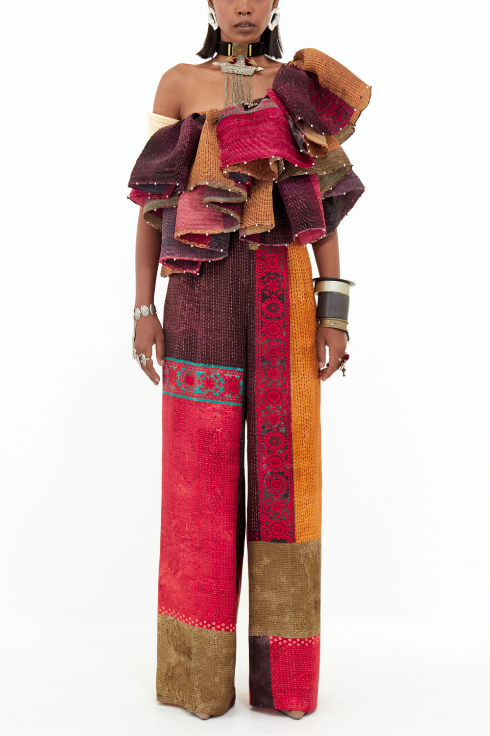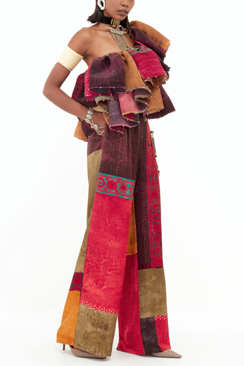 Aseem Kapoor designs this contemporary one-shoulder top customised in crinkle crepe with boho-inspired prints, ruffles and bead detailing featuring an anti-fit, pairing it with matching pants. Style the look with an oxidised choker and an armlet for a boho-chic look.