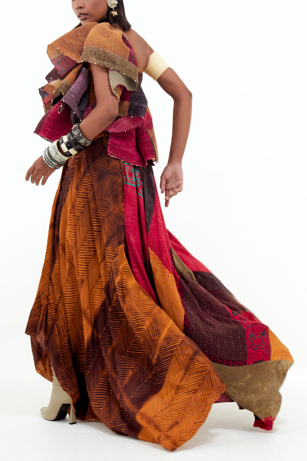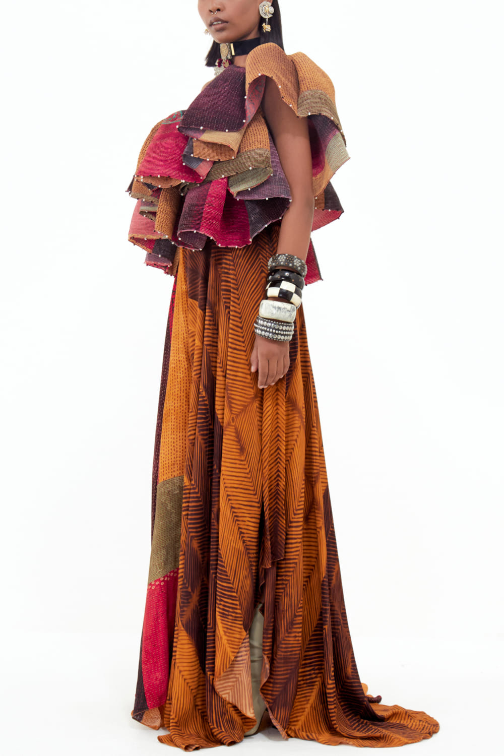 Aseem Kapoor designs this new-age one-shoulder top rendered in crinkle crepe with boho-inspired prints, ruffles and bead detailing featuring an anti-fit, complementing it with a matching chevron-printed flared skirt. Style the look with a cowry necklace and wedges.