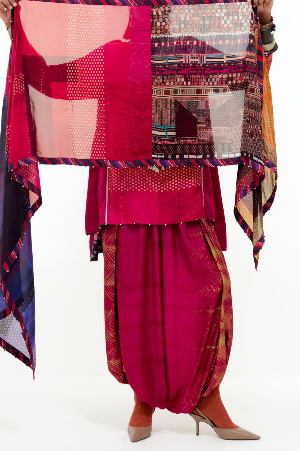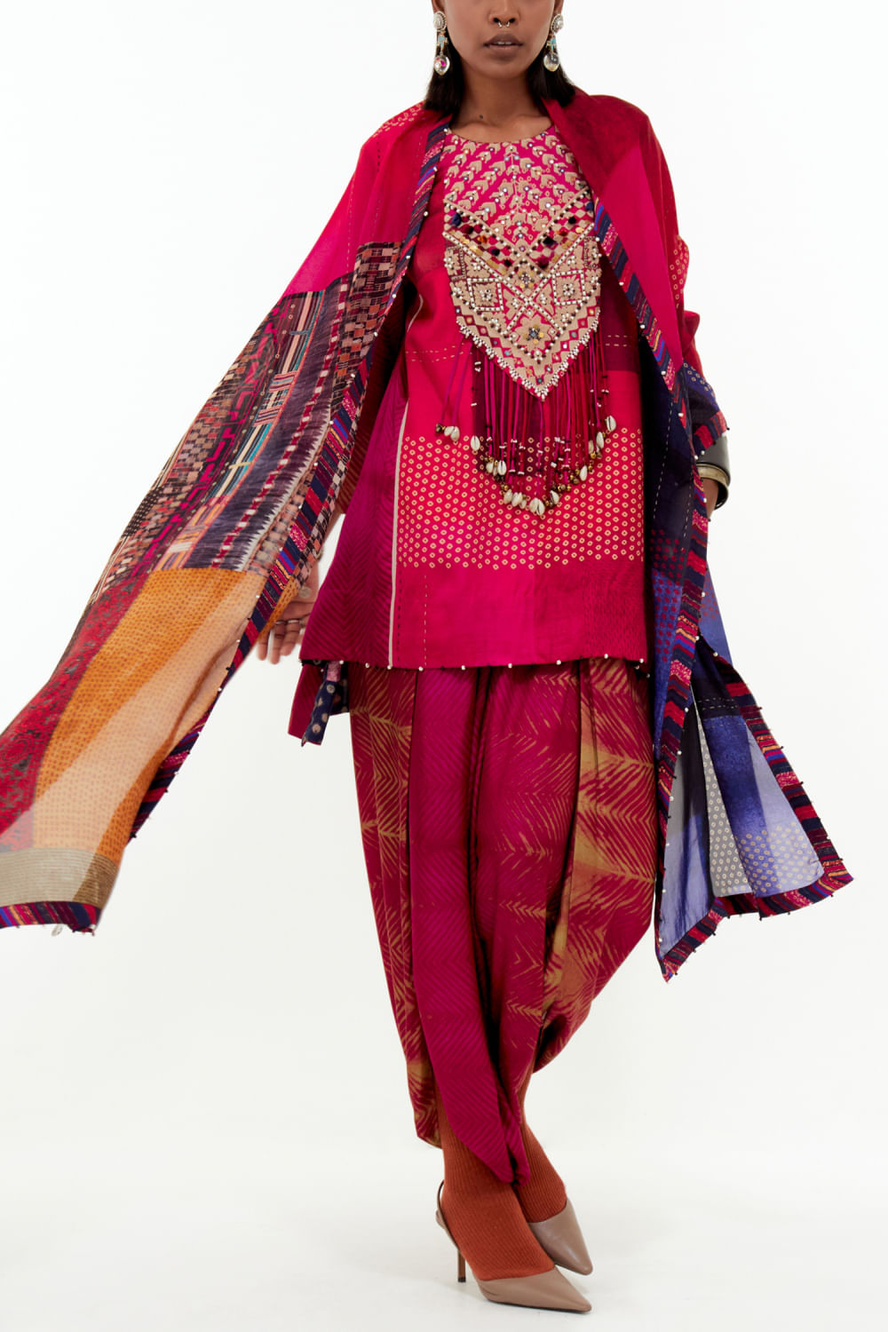 Aseem Kapoor designs this enigmatic short kurta crafted in mushroom twill with boho and chevron prints, bead work and an aari embroidered yoke featuring mirror and tassel detailing in an anti-fit, pairing it with matching draped pants and a matching geometric printed dupatta. Style the look with enamel earrings and a clutch.