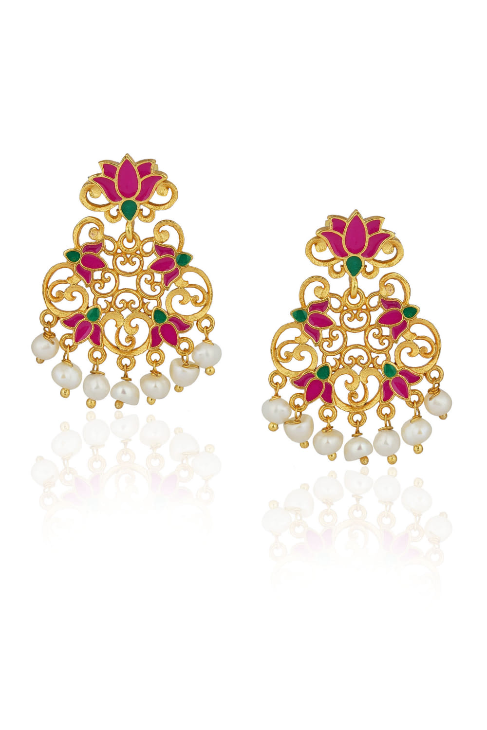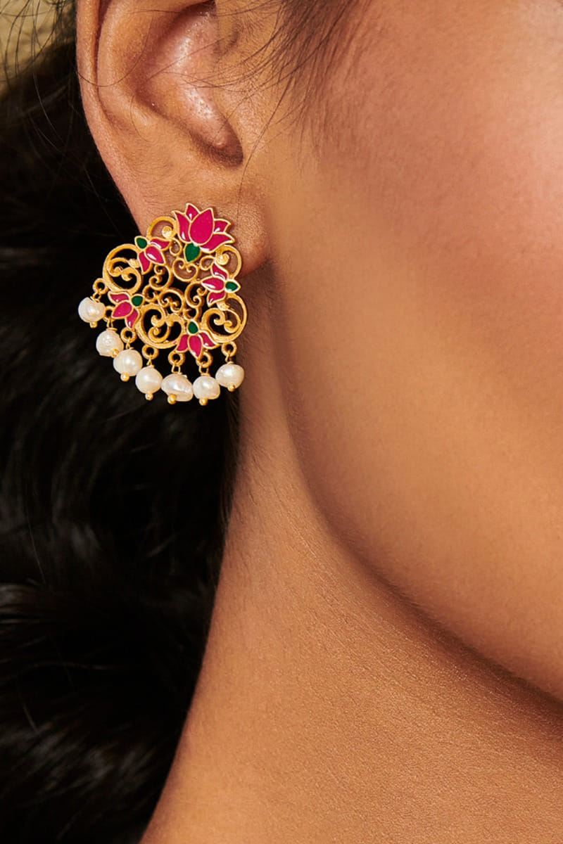Zariin designs this light festive pair of earrings with filigree and enameled lotus patterns, dipped in gold plating. Style them with chic festive sharara ensemble.