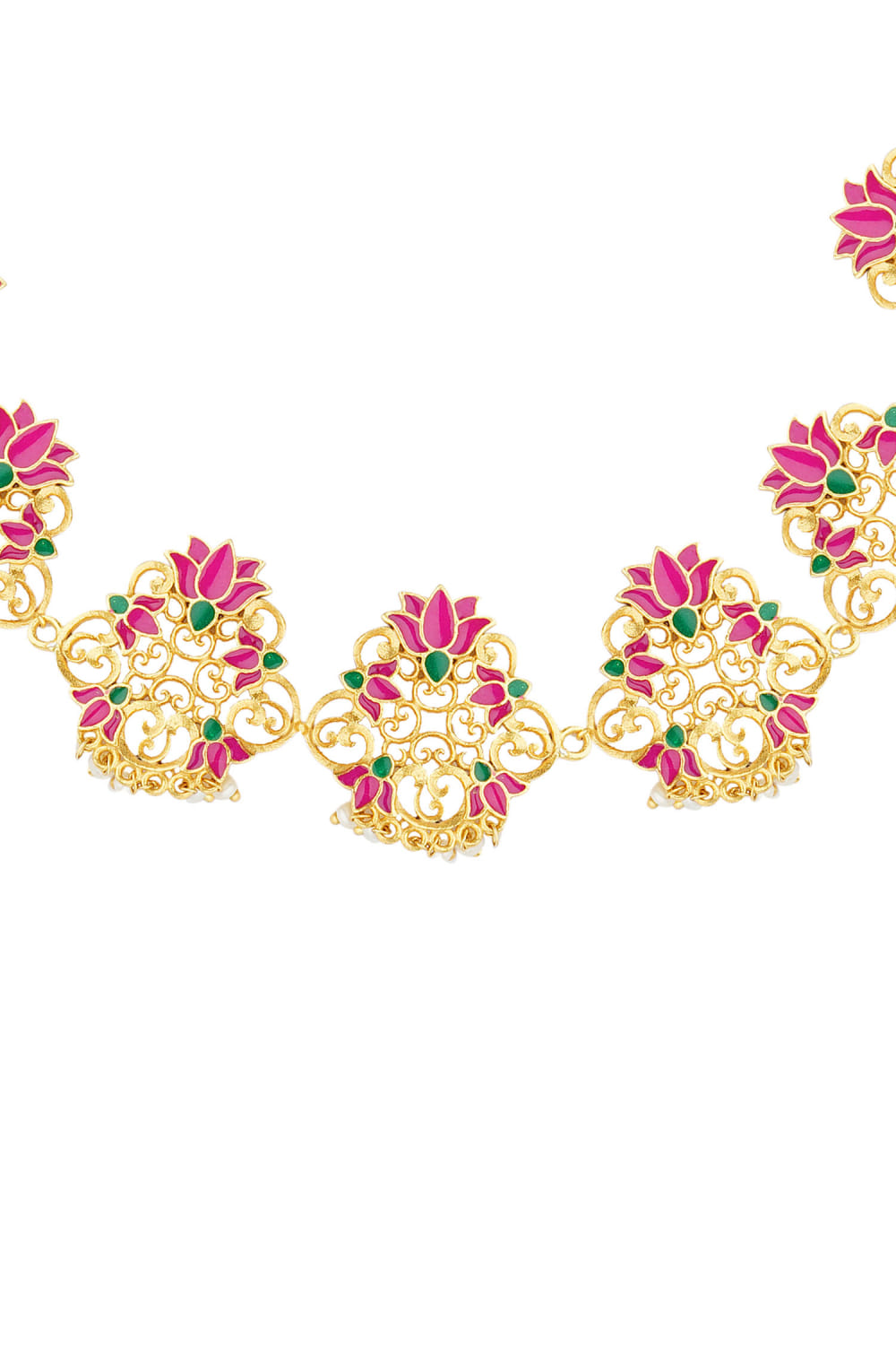 Zariin designs this dazzling matha patti with delicate filigree work customised in 22kt gold plating, featuring enameled lotus motifs and pearl drops. Style it with a concept sari to win compliments.