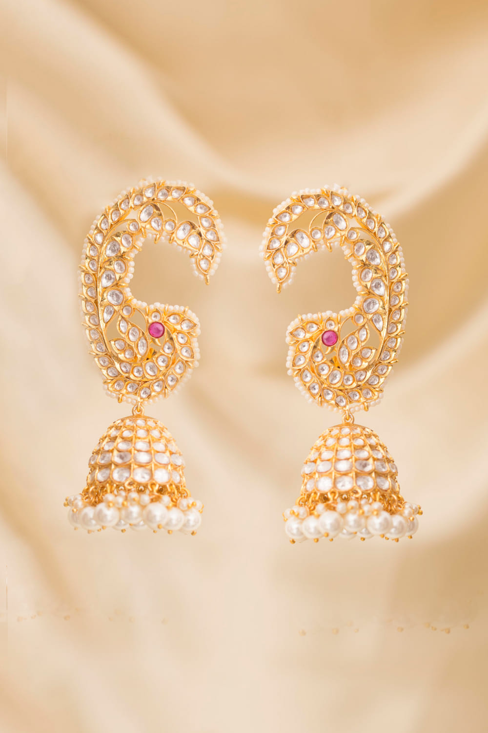 Gold paisley kundan and pearl embellished jhumkas