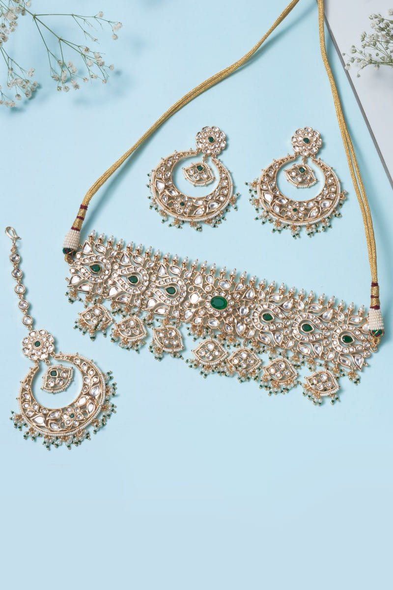 Zevar by Geeta designs this ethereal choker in 22kt gold plating, featuring kundan, polki and pearl embellishments. It is teamed with matching chandbaalis and a maang tikka. Style the set with a traditional lehenga set.