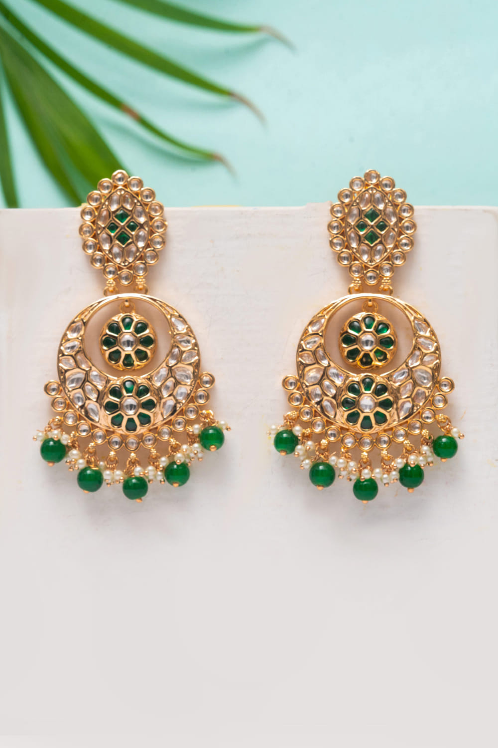 Zevar by Geeta designs this pair of festive chandbaalis adorned with kundan and emerald stones, featuring a floral pattern and dainty pearl drops. Pair them with a benarasi lehenga ensemble for a perfectly chic look.