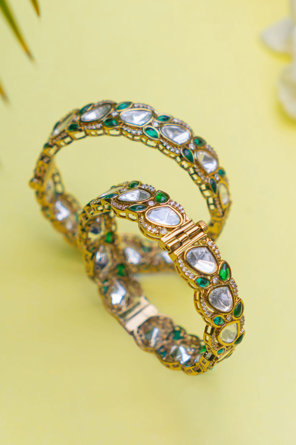 Zevar By Geeta designs this versatile pair of bangles crafted in mixed metal with rhodium polish, enriched with green stone and polki detailing. Style it with a kurta ensemble for an ethnic vibe.