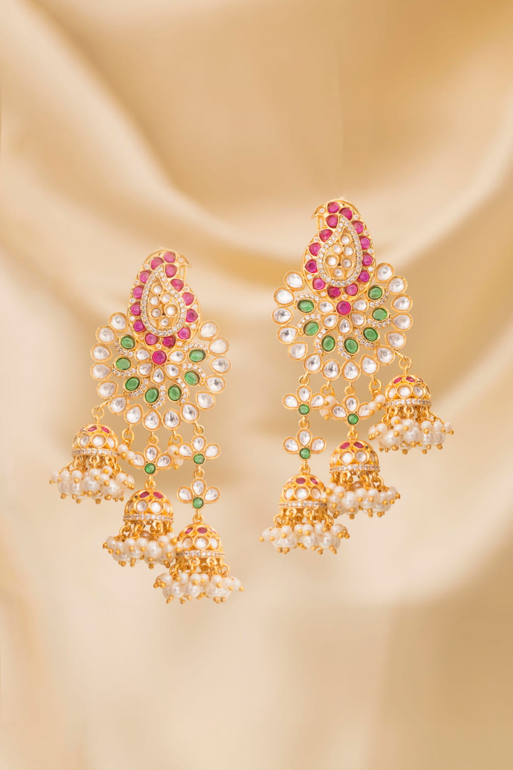 Multicolour meenakari kundan and pearl studded triple jhumkas
