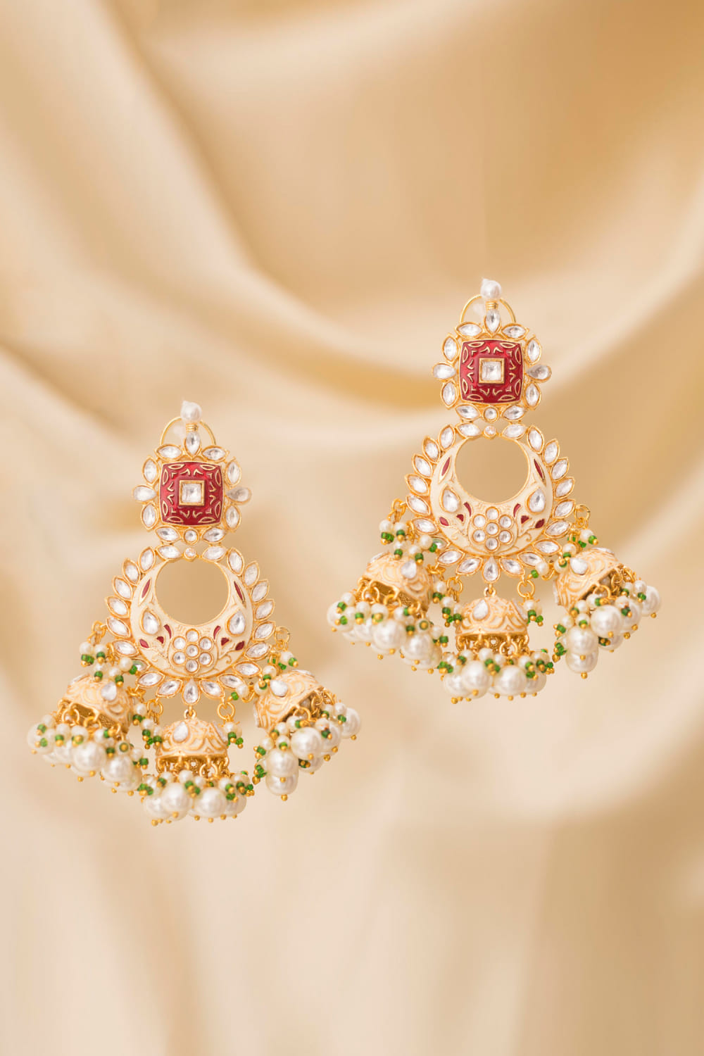 Multicolour meenakari pearl and kundan studded triple jhumkas