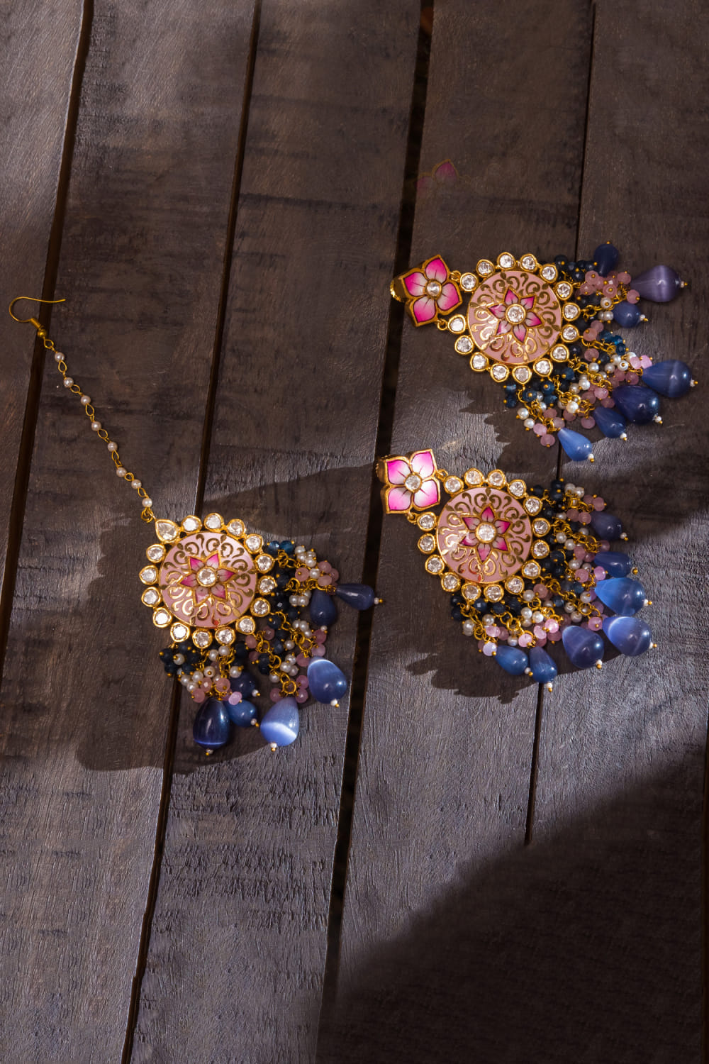 Purple meenakari earrings and maang tikka set